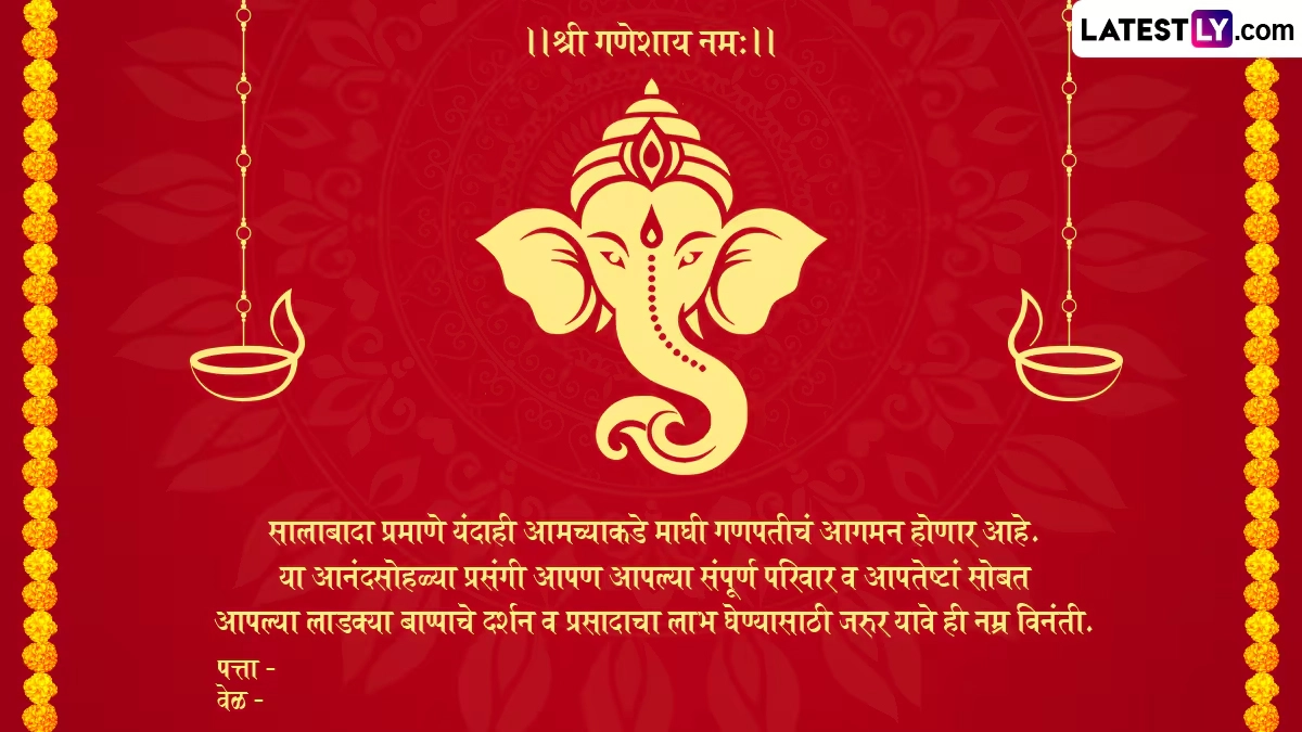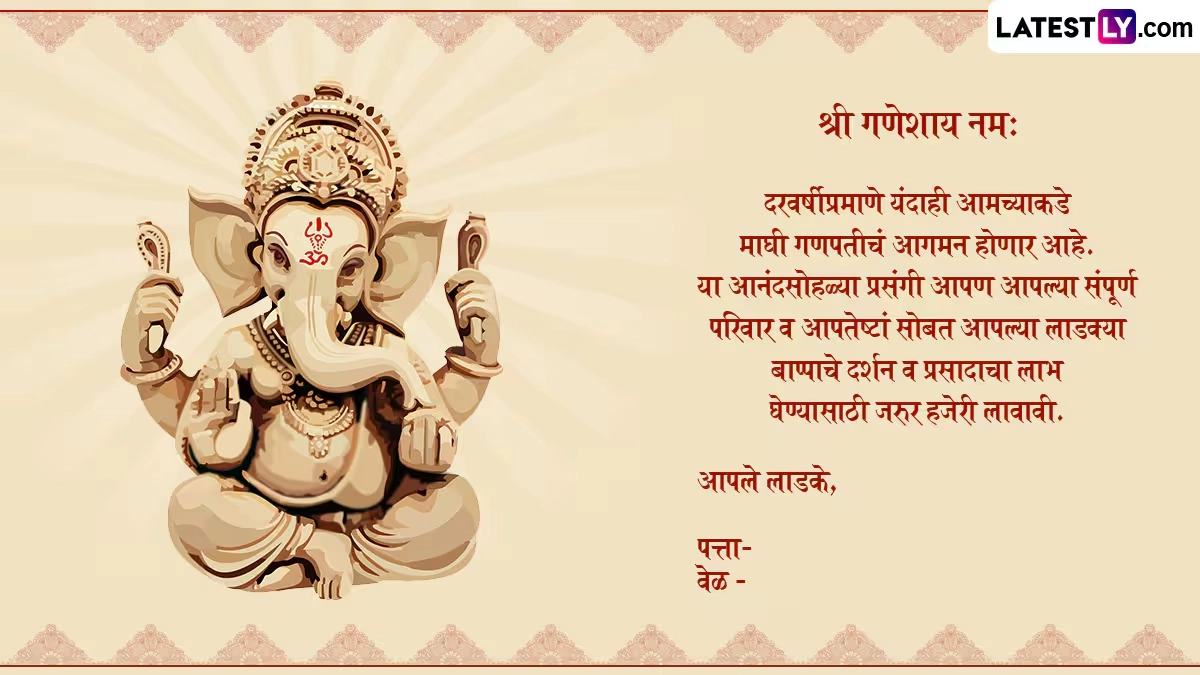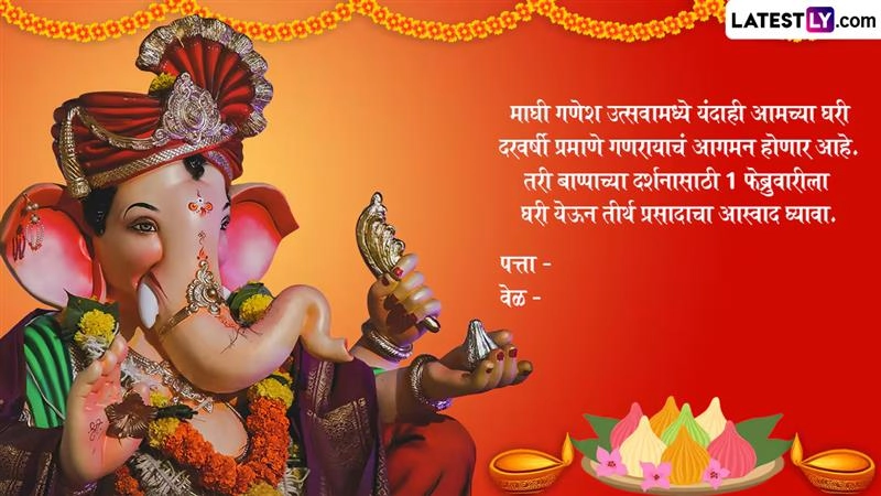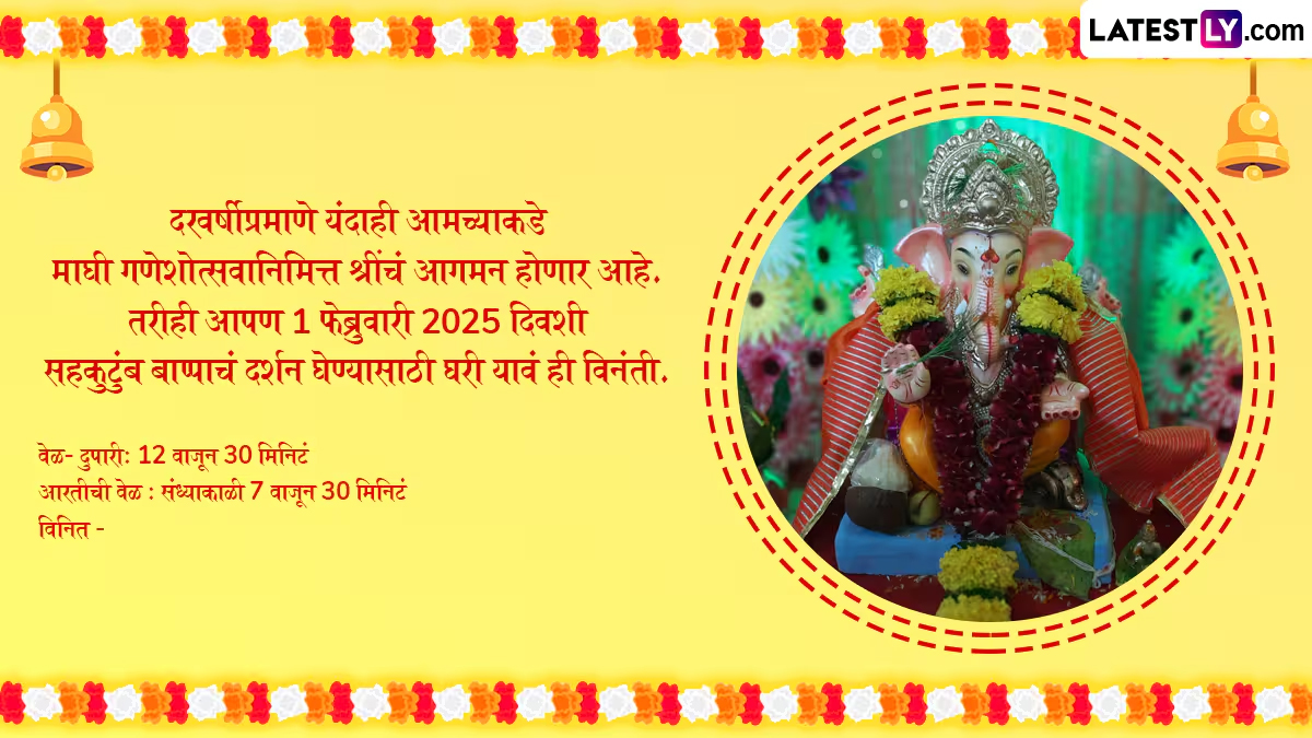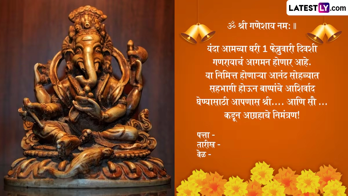 Maghi Ganesh Jayanti Invitation Card In Marathi: माघी गणेश जयंती (Maghi Ganesh Jayanti) 1 फरवरी 2025 को मनाई जाएगी. माघी गणेश जयंती महाराष्ट्र और कोंकण में बड़े उत्साह के साथ मनाई जाती है. जिस दिन भगवान गणेश पुनः जीवित हुए वह माघ माह की माघ शुद्ध चतुर्थी का दिन था. इसलिए हर साल इस दिन को माघी गणेश उत्सव के रूप में मनाया जाता है. गणेश भक्त माघी गणेश जयंती बड़े उत्साह के साथ मनाते हैं. माघी गणेश जयंती बप्पा के भक्तों के लिए बेहद खास होती है. इस दिन वे अपने घरों में भगवान गणेश की पूजा करते हैं और बड़ी श्रद्धा से प्रार्थना करते हैं. इसके अलावा, कुछ गणेश भक्त इस दिन पूरे दिन उपवास भी रखते हैं. यह भी पढ़ें: Maghi Ganesh Jayanti 2025 Rangoli Designs: माघी गणेश जयंती के पर्व को रंगोली के इन मनमोहक डिजाइन्स से बनाएं खास, देखें ट्यूटोरियल वीडियोज