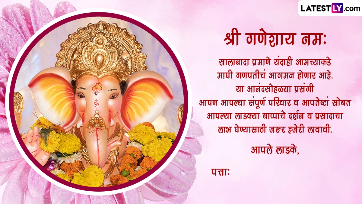 Maghi Ganpati 2024 Invitation Card Format in Marathi: गणेश जयंती (Ganesh Jayanti) के पर्व को भगवान शिव (Bhagwan Shiv) और माता पार्वती (Mata Parvati) के लाड़ले पुत्र गणेश जी (Ganesh) के जन्मोत्सव के तौर पर मनाया जाता है. हिंदू पंचांग के अनुसार, गणेश चतुर्थी का पर्व भाद्रपद मास में मनाया जाता है, जबकि माघ मास के शुक्ल पक्ष की चतुर्थी को माघी गणेश जयंती (Maghi Ganesh Jayanti) के नाम से जाना जाता है. इस साल माघी गणेश जयंती का पर्व 13 फरवरी 2024 को मनाया जा रहा है. इस दौरान भक्त गणपति बप्पा (Ganpati Bappa) की प्रतिमाओं को अपने घर लाते हैं और उनकी विशेष पूजा-अर्चना की जाती है. इसके साथ ही सार्वजनिक पंडालों में भी गणपति बप्पा का आगमन होता है, जिसके लिए कई दिन पहले से तैयारियां की जाती हैं.