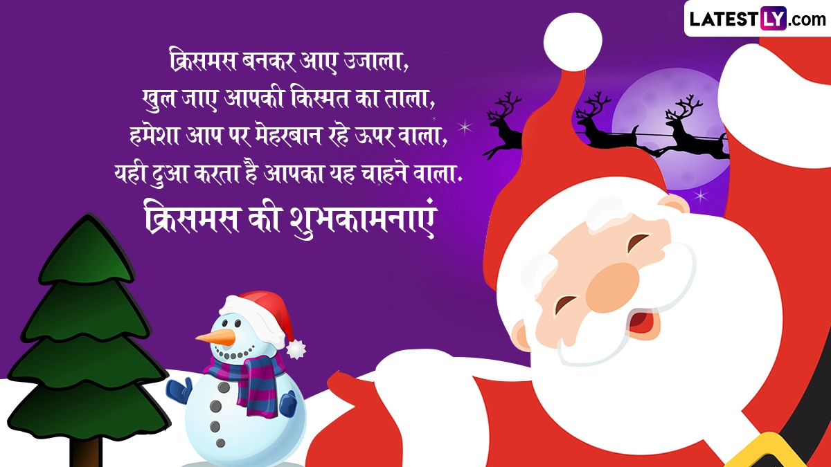 दुनिया भर में हर साल 25 दिसंबर को क्रिसमस का त्योहार धूमधाम से मनाया जाता है, जिसका हर किसी को बेसब्री से इंतजार रहता है. दरअसल, ईसाई धर्म के लोग प्रभु यीशु यानी ईसा मसीह के जन्मदिन की खुशी में क्रिसमस का त्योहार मनाते हैं. इस अवसर पर आप इन शानदार हिंदी विशेज, कोट्स, वॉट्सऐप मैसेजेस, फेसबुक ग्रीटिंग्स के जरिए प्रियजनों को क्रिसमस की प्यार भरी शुभकामनाएं दे सकते हैं.