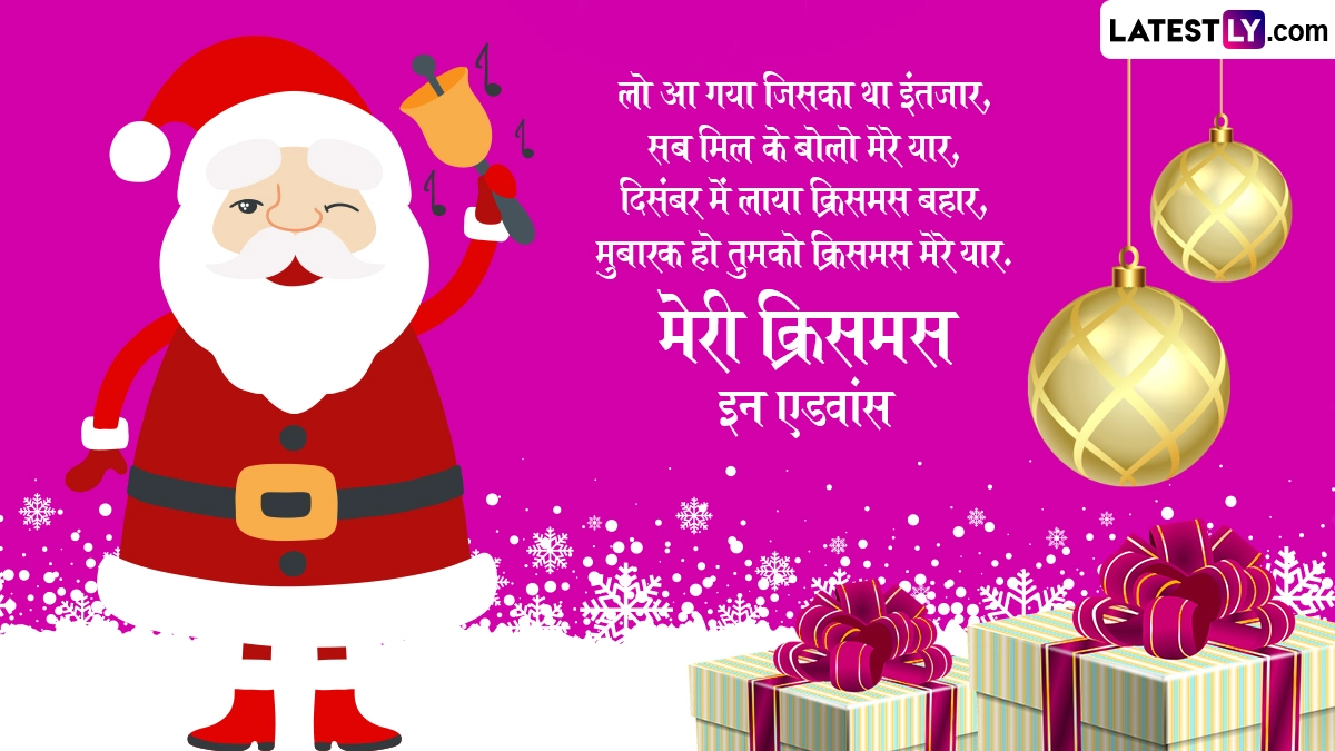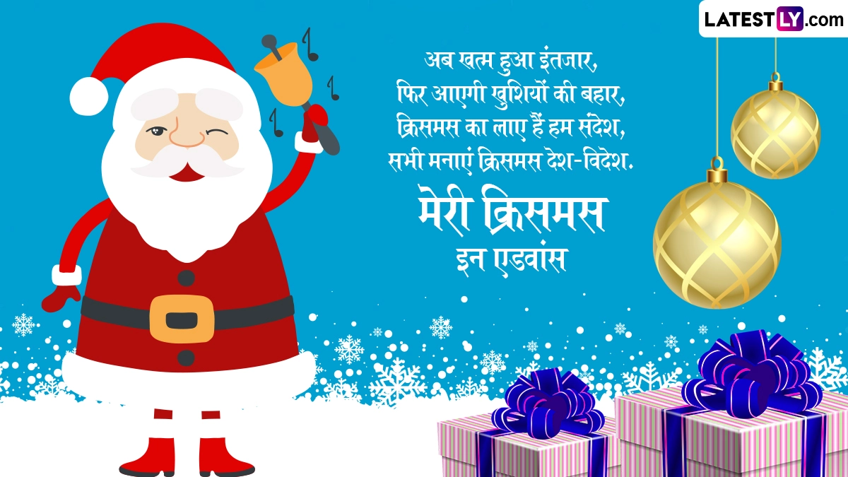 Merry Christmas in Advance 2024 Messages in Hindi: दिसंबर (December) साल का आखिरी महीना होता है, जिसकी शुरुआत होते ही दुनियाभर के लोग क्रिसमस (Christmas) और नए साल (New Year) का जश्न मनाने की तैयारियों में जुट जाते हैं. ईसाई धर्म के सबसे बड़े त्योहार क्रिसमस को दुनियाभर में बहुत धूमधाम से मनाया जाता है. यह एक ऐसा त्योहार है जिसे सभी धर्मों के लोग पूरे जोश और उत्साह के साथ सेलिब्रेट करते हैं. दरअसल, ईसा मसीह के जन्मोत्सव का जश्न मनाने के लिए क्रिसमस का त्योहार धूमधाम से मनाया जाता है. इस पर्व को मनाने के लिए लोग अपने घरों की न सिर्फ साफ-सफाई करते हैं, बल्कि उसे कई दिन पहले से सजाने में भी जुट जाते हैं. इस दिन पार्टी और दावतों का आयोजन किया जाता है. सीक्रेट सैंटा बनकर लोग एक-दूसरे को उपहार देते हैं.