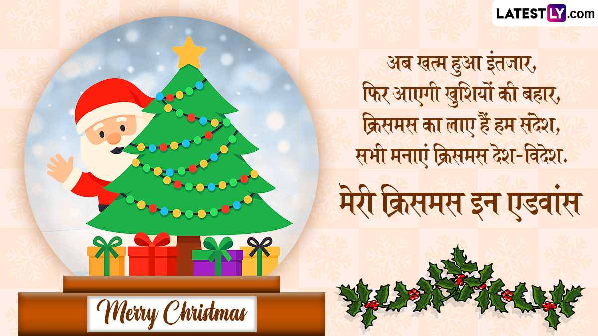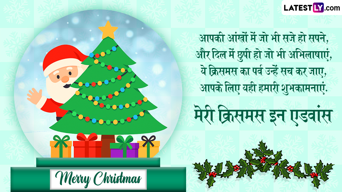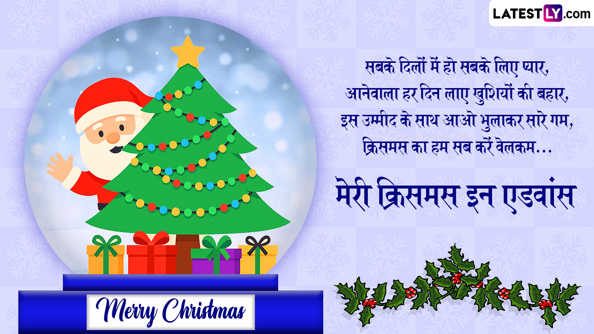 साल के सबसे आखिरी पर्व क्रिसमस को छुट्टियों के मौसम की शुरुआत का प्रतीक भी माना जाता है, क्योंकि क्रिसमस की पूर्व संध्या से लेकर नए साल के आगमन तक हर कोई जश्न में सराबोर नजर आता है. यहां तक कि क्रिसमस से पहले ही बधाइयों का सिलसिला शुरु हो जाता है. ऐसे में आप भी मेरी क्रिसमस इन एडवांस कहने के लिए अपनों के साथ इन हिंदी विशेज, कोट्स, वॉट्सऐप मैसेजेस, फेसबुक ग्रीटिंग्स को शेयर कर सकते हैं.