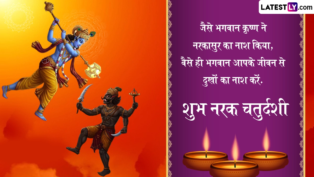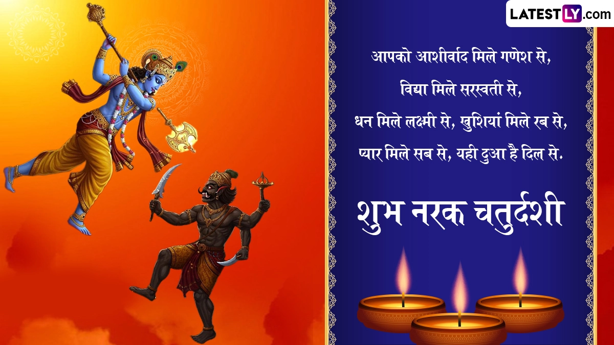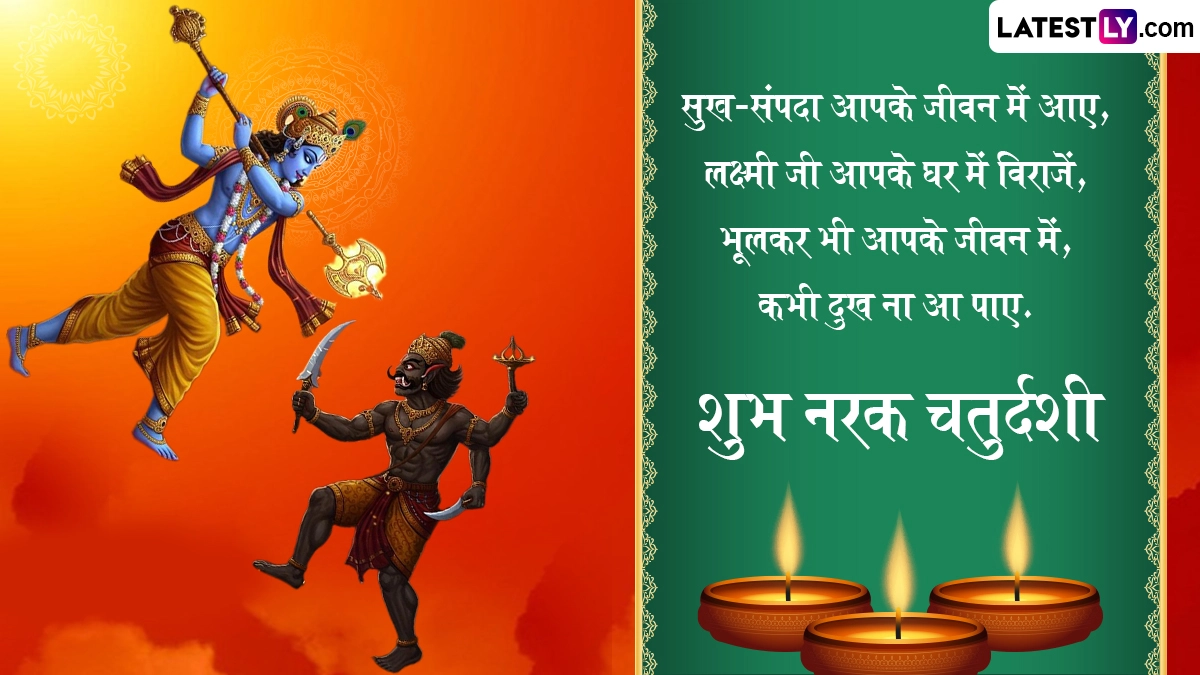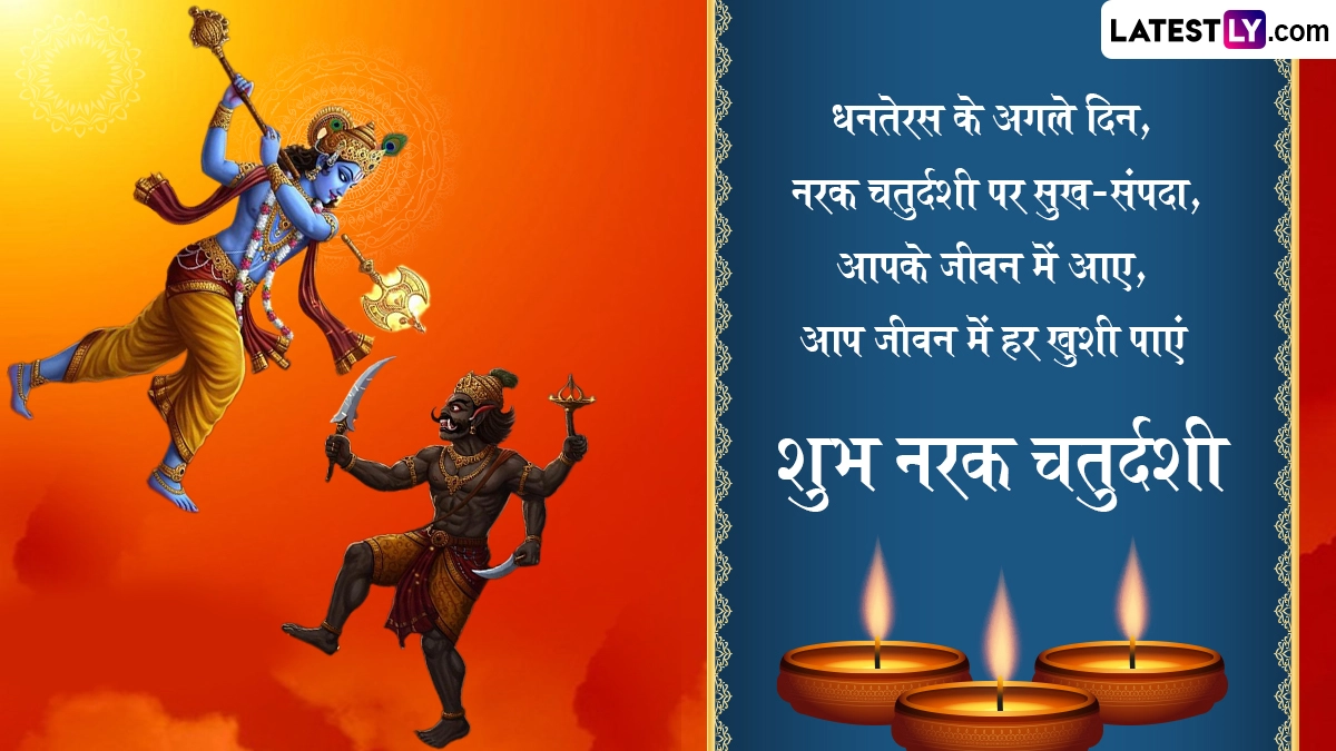 Narak Chaturdashi 2025 Wishes: नरक चतुर्दशी (Narak Chaturdashi 2025), को छोटी दिवाली (Choti Diwali) के नाम से भी जाना जाता है. यह त्यौहार भारत के विभिन्न राज्यों में विशेष रूप से महाराष्ट्र, गुजरात और उत्तर प्रदेश में हर्षोल्लास के साथ मनाया जाता है. यह पर्व दिवाली से एक दिन पहले, कार्तिक मास के कृष्ण पक्ष की चतुर्दशी तिथि को आता है. इस साल नरक चतुर्दशी 19 अक्टूबर को मनाई जा रही है. इस दिन लोग घर की सफाई करते हैं, उबटन लगाकर स्नान करते हैं और दीप जलाकर बुराई पर अच्छाई की जीत का उत्सव मनाते हैं. साथ ही, वे एक-दूसरे को शुभकामनाएं और बधाई संदेश भेजकर प्रेम और सौहार्द का आदान-प्रदान करते हैं. इसी भावना को आगे बढ़ाते हुए, हम आपके लिए हैप्पी छोटी दिवाली 2025 की शुभकामनाएं, नरक चतुर्दशी स्पेशल मैसेज, इमेजेस और बधाइयों का एक संग्रह प्रस्तुत कर रहे हैं, जिन्हें आप मुफ्त में डाउनलोड कर अपने प्रियजनों के साथ साझा कर सकते हैं. यह भी पढ़ें: Diwali 2025: इस वर्ष दिवाली पर बन रहे हैं इतने सारे ग्रहों के दिव्य संयोग! जानें किन राशि को क्या प्रतिफल देने वाले हैं ये ग्रह!