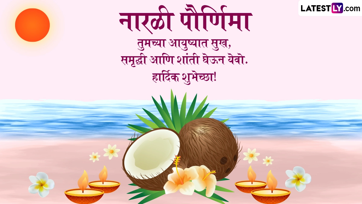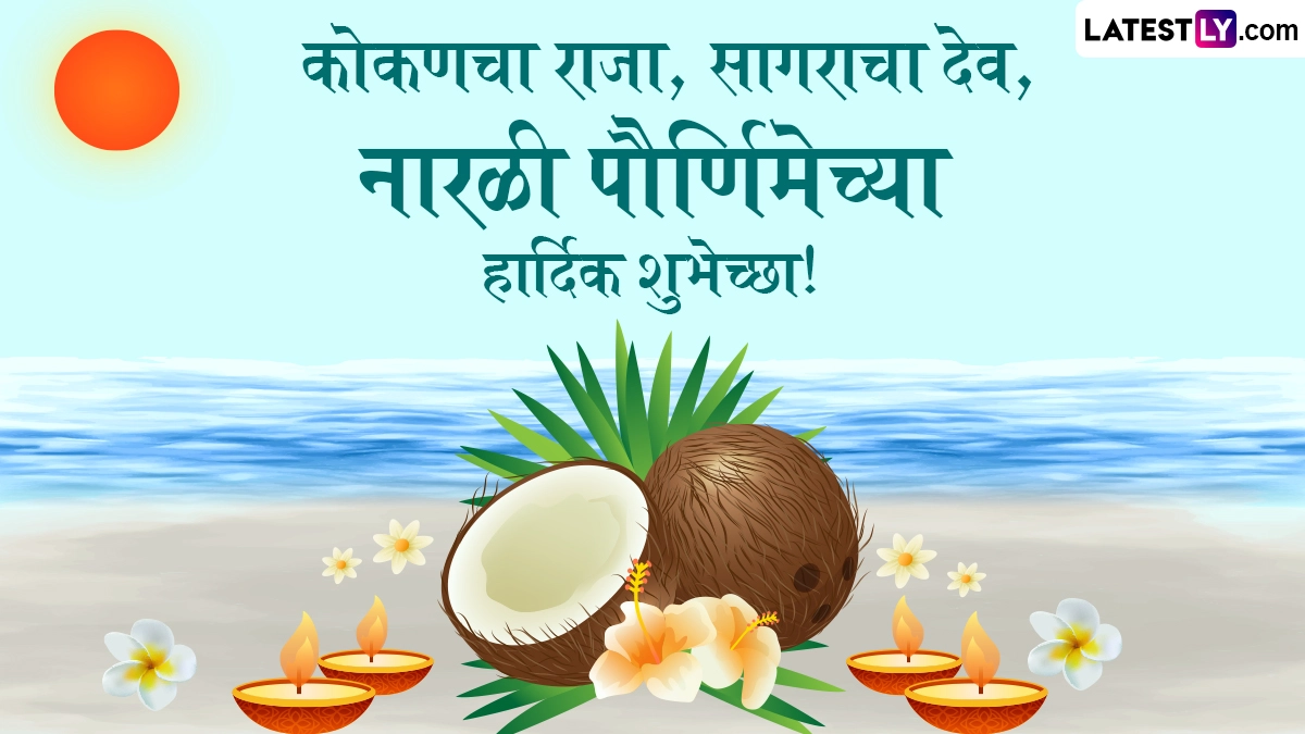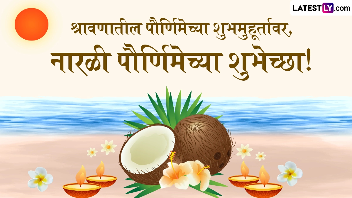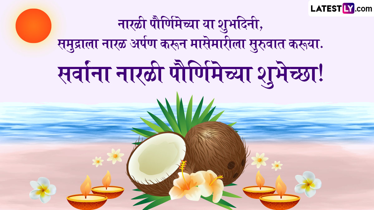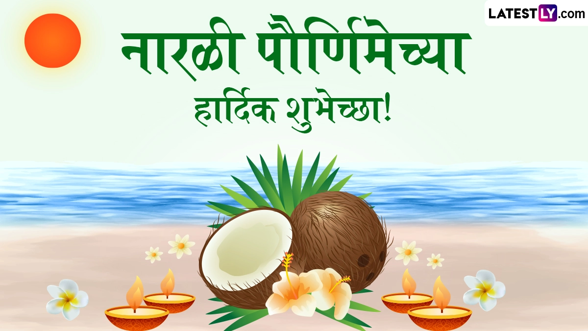 Narali Purnima Wishes in Marathi: नारली पूर्णिमा एक पवित्र त्योहार है जिसे तटीय समुदाय, विशेष रूप से महाराष्ट्र में गहरी श्रद्धा और पारंपरिक रीति-रिवाजों के साथ मनाते हैं. साल 2025 में नारली पूर्णिमा 9 अगस्त को मनाई जाएगी. नारली शब्द मराठी शब्द नारल से आया है, जिसका अर्थ नारियल होता है, और "पूर्णिमा" पूर्णिमा के दिन को दर्शाता है. यह त्योहार मानसून के मौसम के अंत का प्रतीक है और मुंबई और आसपास के क्षेत्रों सहित कोंकण तट पर रहने वाले मछुआरा समुदायों के लिए विशेष रूप से महत्वपूर्ण है. द्रिक पंचांग के अनुसार यह त्यौहार शनिवार, 9 अगस्त 2025 को मनाया जाएगा. नारली पूर्णिमा समुद्र के हिंदू देवता भगवान वरुण को समर्पित है, जिनकी पूजा मछुआरों की सुरक्षा और समृद्धि सुनिश्चित करने के लिए की जाती है, क्योंकि वे कठिन मानसून के बाद अपना काम फिर से शुरू करने की तैयारी कर रहे होते हैं. कृतज्ञता के प्रतीक और शांत जल की प्रार्थना के रूप में समुद्र में नारियल चढ़ाए जाते हैं. यह भी पढ़ें: Nariyal Purnima 2025 Wishes: नारियल पूर्णिमा के दिन अपने इष्ट-मित्रों को ये शुभकामनाएं भेजकर पर्व का आनंद उठाएं!