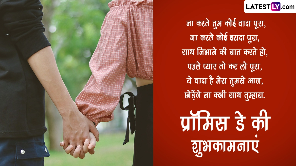Happy Promise Day 2024 Wishes in Hindi: वैसे तो प्यार करने वालों के लिए हर दिन वैलेंटाइन डे (Valentine Day) होता है, बावजूद इसके प्यार के खूबसूरत एहसास को अपने पार्टनर के साथ जताने के लिए फरवरी महीने में वैलेंटाइन वीक (Valentine Week) मनाया जाता है. वैलेंटाइन वीक की शुरुआत 7 फरवरी को रोज डे (Rose Day) के साथ होती है और 14 फरवरी को वैलेंटाइन डे के साथ प्यार के इस सप्ताह का समापन होता है. अपने प्यार को बयां करने और जीवन भर साथ निभाने का वादा करने के लिए प्रॉमिस डे मनाया जाता है. प्रॉमिस डे (Promise Day) वैलेंटाइन वीक के पांचवें दिन यानी 11 फरवरी को मनाया जाता है. इस दिन कपल्स (Couples) एक-दूसरे से खास अंदाज में न सिर्फ प्यार का इजहार करते हैं, बल्कि जीवन भर साथ निभाने का एक-दूसरे से वादा भी करते हैं.