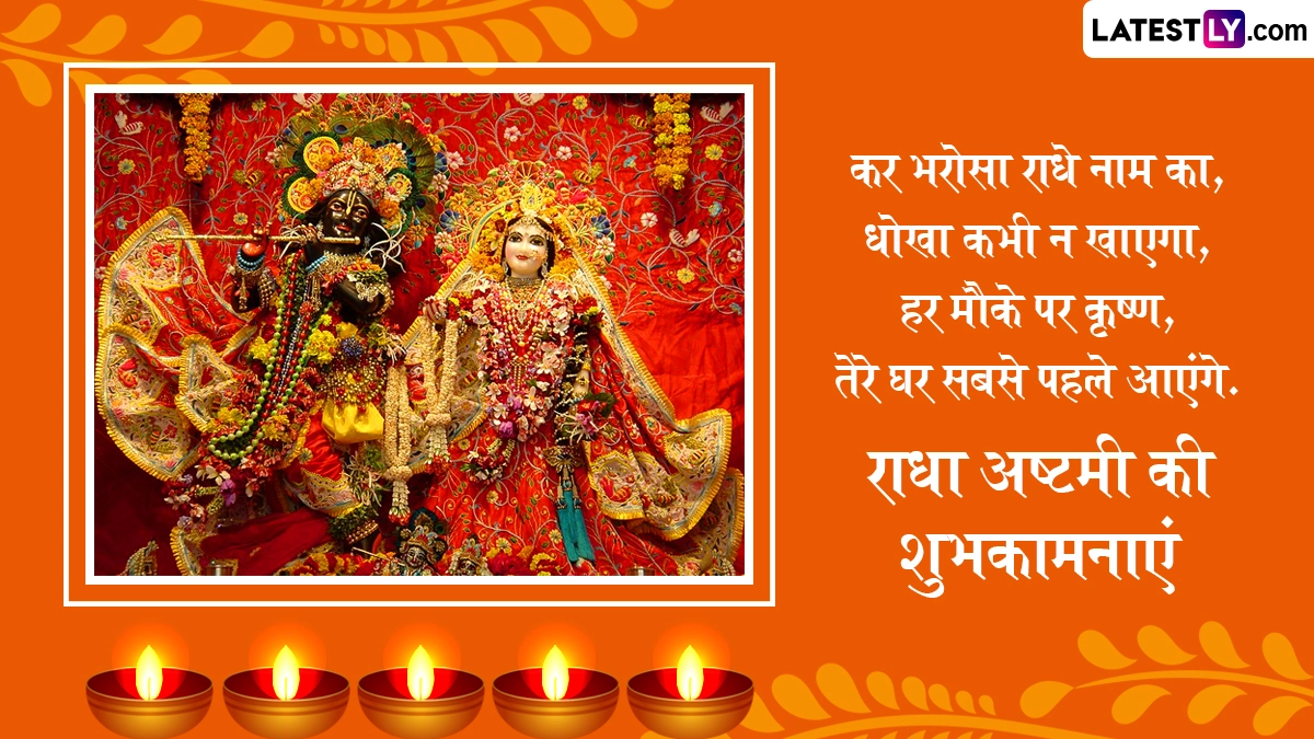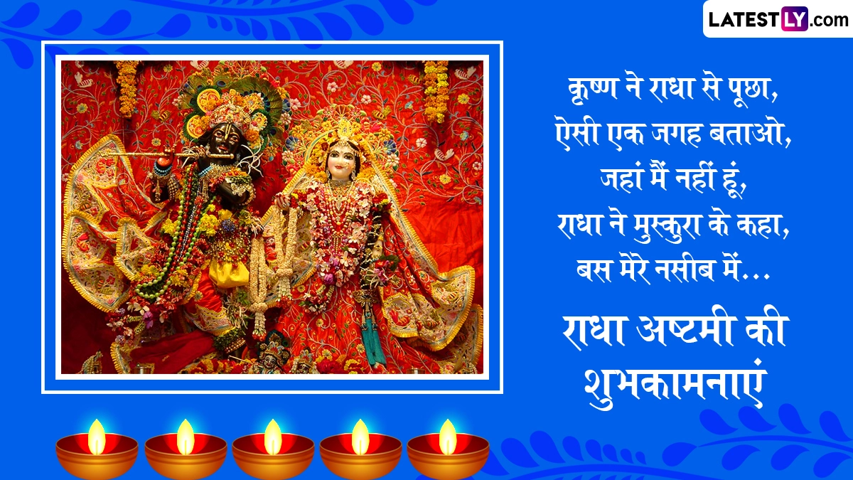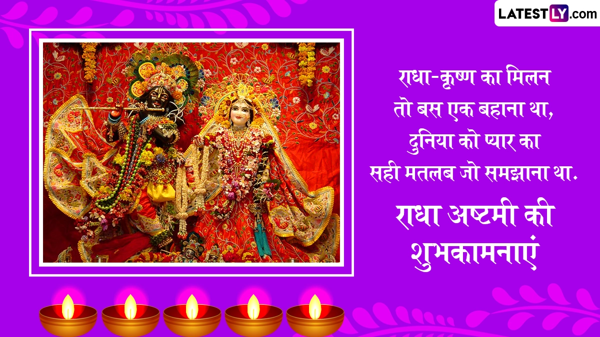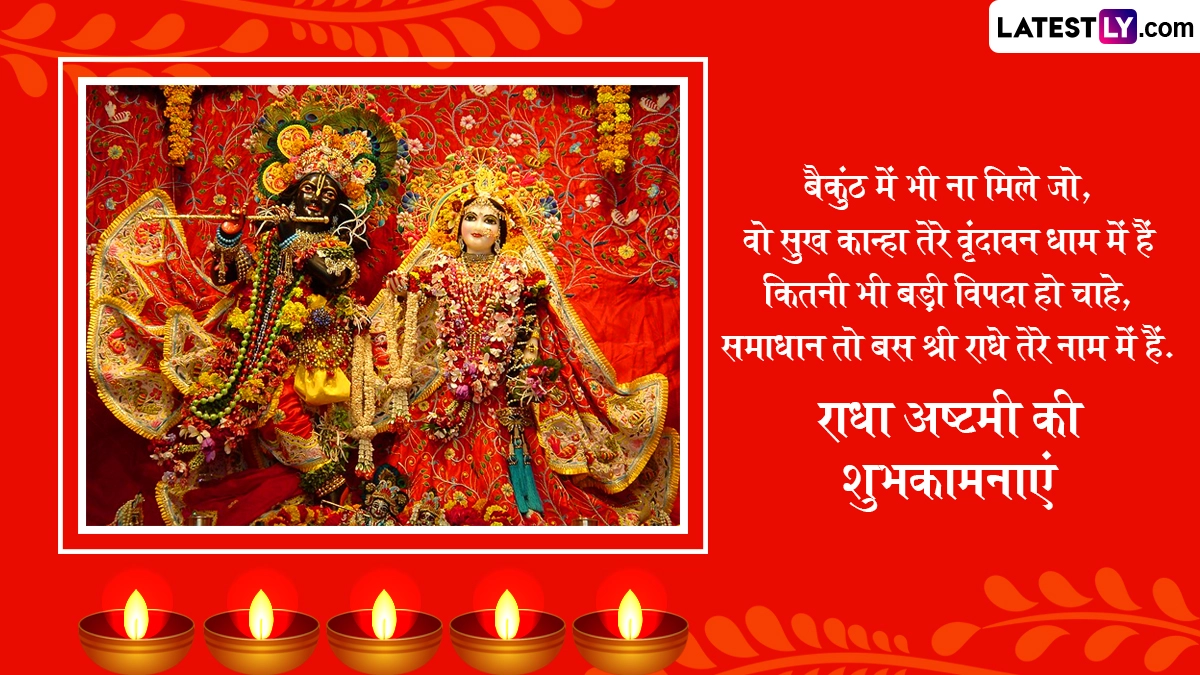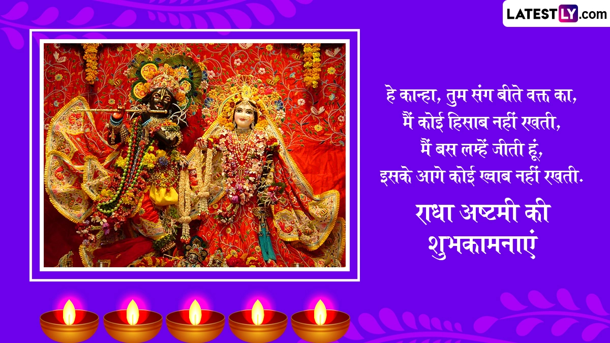 Radha Ashtami 2025 Wishes in Hindi: सनातन धर्म में राधा अष्टमी (Radha Ashtami) का विशेष महत्व बताया जाता है. राधा रानी के जन्मोत्सव के इस पर्व को श्रीकृष्ण जन्माष्टमी (Krishna Janmashtami) मनाए जाने के ठीक 15 दिन बाद मनाया जाता है. हिंदू पंचांग के अनुसार, हर साल भाद्रपद मास के शुक्ल पक्ष की अष्टमी तिथि को राधा अष्टमी का पर्व मनाया जाता है. इस दिन श्रद्धालु राधा-कृष्ण (Radha-Krishna) की आराधना कर उनके आशीर्वाद की कामना करते हैं. इस दिन देशभर के राधा-कृष्ण मंदिरों में विशेष पूजा-अनुष्ठान और भजन-कीर्तन का आयोजन किया जाता है. भक्त व्रत रखकर विधि-विधान से राधा रानी और श्रीकृष्ण की पूजा करते हैं. इस साल उदयातिथि को ध्यान में रखते हुए राधा अष्टमी 31 अगस्त 2025, रविवार को मनाई जा रही है.