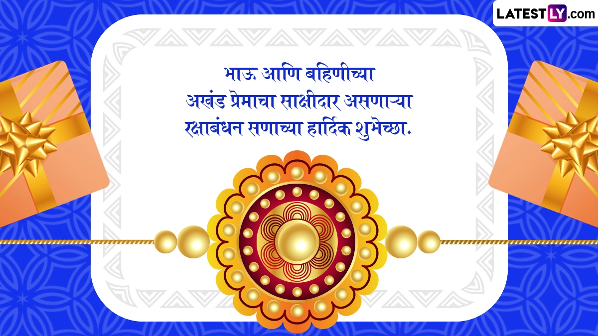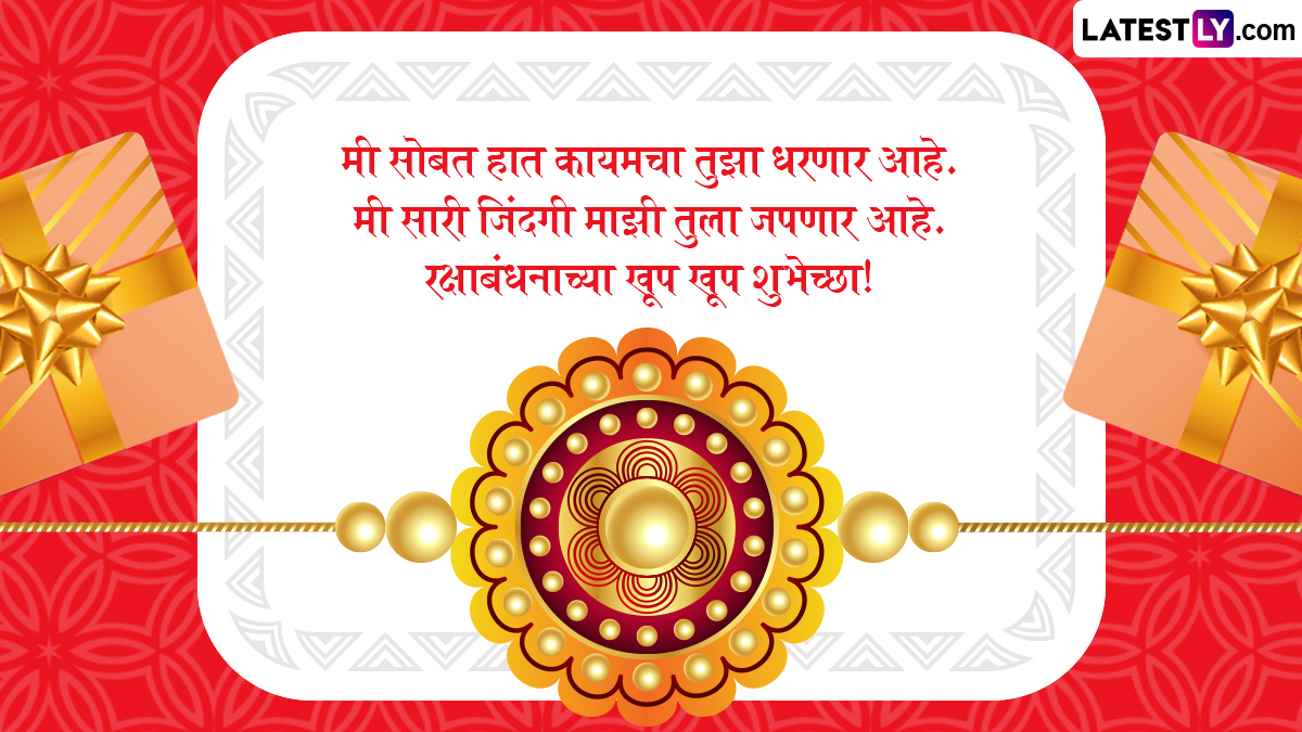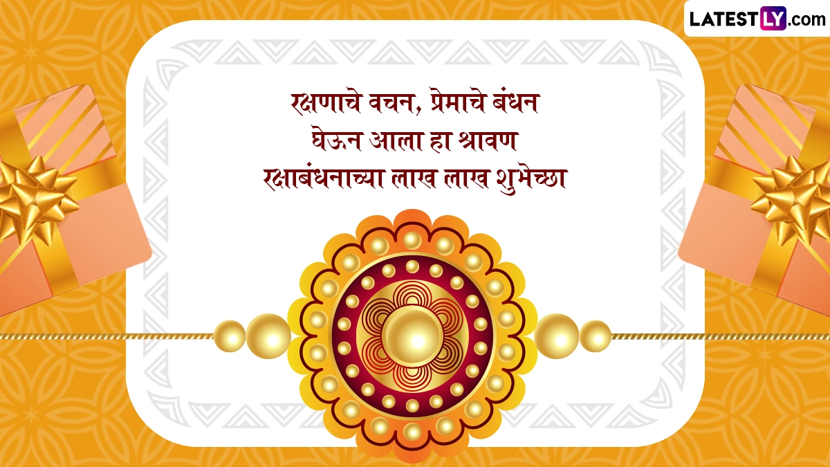 Raksha Bandhan Marathi Wishes: भाई-बहन के पवित्र बंधन का त्योहार नज़दीक है. द्रिक पंचांग के अनुसार, भद्रा के दौरान बंधन संस्कार नहीं करना चाहिए. यह श्रावण मास की पूर्णिमा तिथि पर मनाया जाता है. द्रिक पंचांग के अनुसार, यह 8 अगस्त को दोपहर 2:12 बजे से शुरू होकर 9 अगस्त को दोपहर 1:24 बजे समाप्त होगा. द्रिक पंचांग के अनुसार, "रक्षाबंधन पर राखी बाँधने का सबसे अच्छा समय अपराह्न काल है, जो हिंदू पंचांग के अनुसार दोपहर के बाद का समय है. यदि अपराह्न काल उपलब्ध न हो, तो प्रदोष काल भी रक्षाबंधन से संबंधित अनुष्ठान करने के लिए उपयुक्त है. इस दिन, बहन अपने भाई की कलाई पर राखी बांधकर उसकी खुशी और खुशहाली की कामना करती है, जबकि भाई जीवन भर उसकी रक्षा करने का वचन देता है. यह त्योहार भारतीय पौराणिक कथाओं में निहित है, जिसमें भगवान कृष्ण और द्रौपदी, तथा यमुना और यम जैसी कहानियां इस बंधन की आध्यात्मिक और भावनात्मक गहराई को उजागर करती हैं. यह भी पढ़ें: Raksha Bandhan 2025: 95 साल बाद रक्षाबंधन पर बन रहा है महासंयोग, इस मुहूर्त में राखी बांधना होगा बेहद शुभ