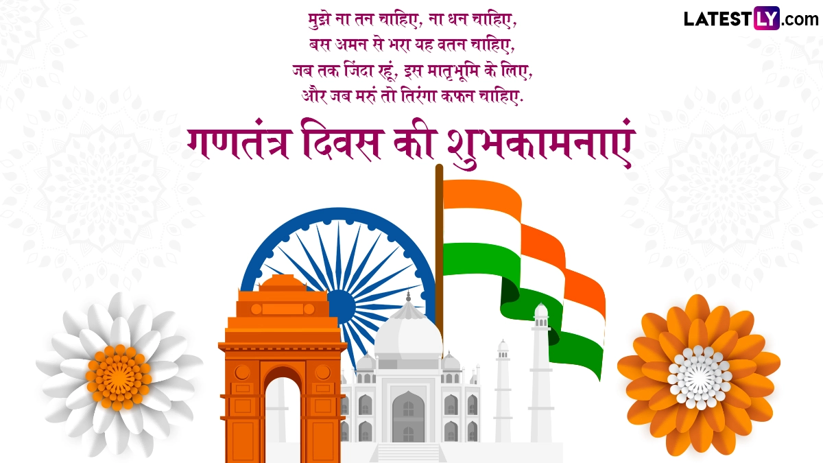 भारतीय संविधान को लागू करने के लिए 26 जनवरी के दिन को इसलिए चुना गया था, क्योंकि सन 1930 में इसी दिन भारतीय राष्ट्रीय कांग्रेस ने भारत को पूर्ण स्वराज घोषित किया था. पूरे देश में गणतंत्र दिवस का जश्न हर्षोल्लास के साथ मनाया जाता है. ऐसे में गणतंत्र दिवस के इस खास अवसर पर आप इन शानदार हिंदी विशेज, वॉट्सऐप मैसेजेस, जीआईएफ ग्रीटिंग्स, शायरी को भेजकर सबको शुभकामनाएं दे सकते हैं.