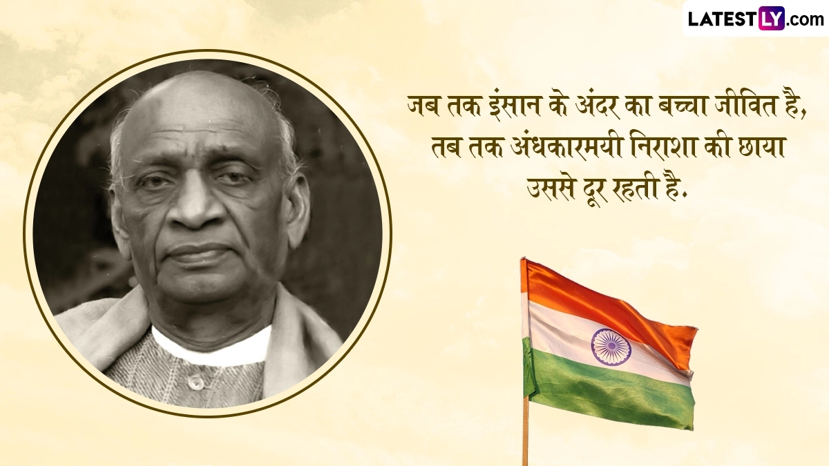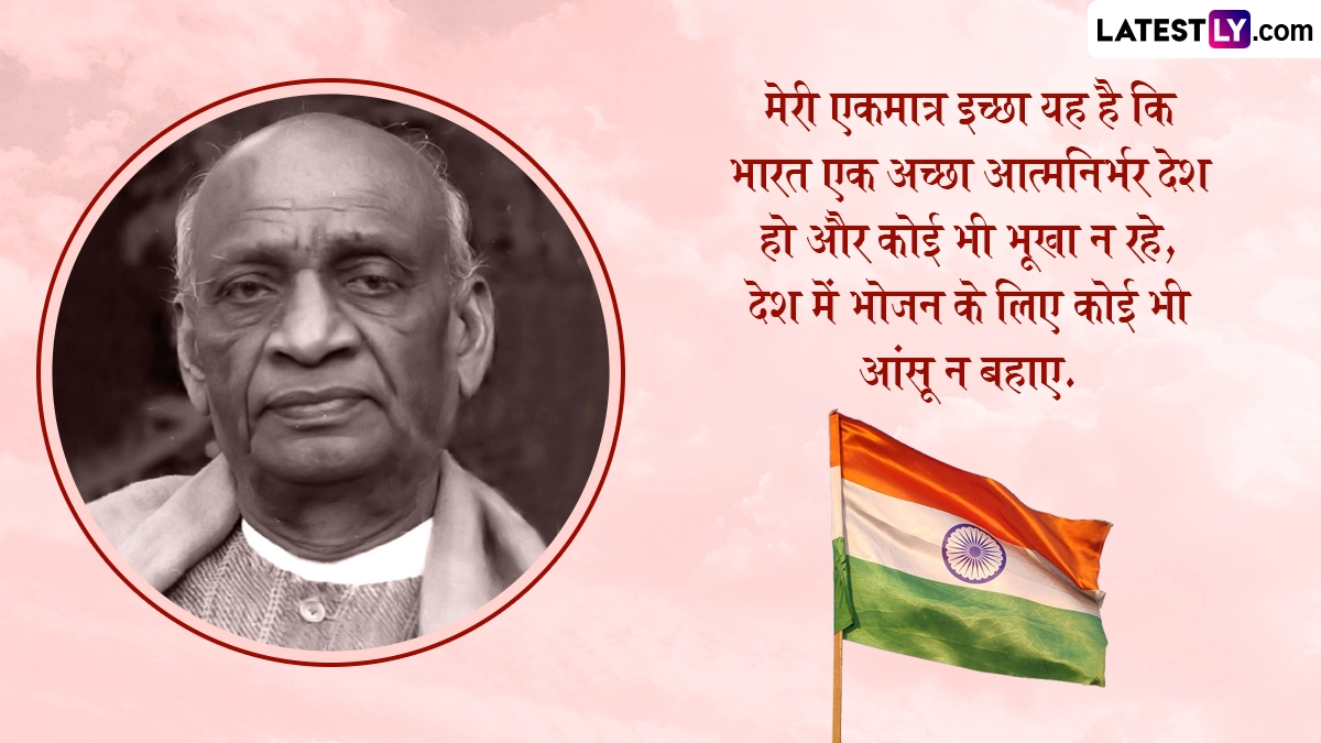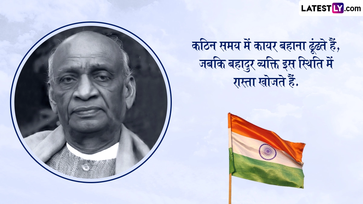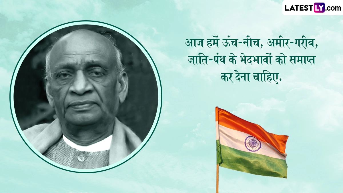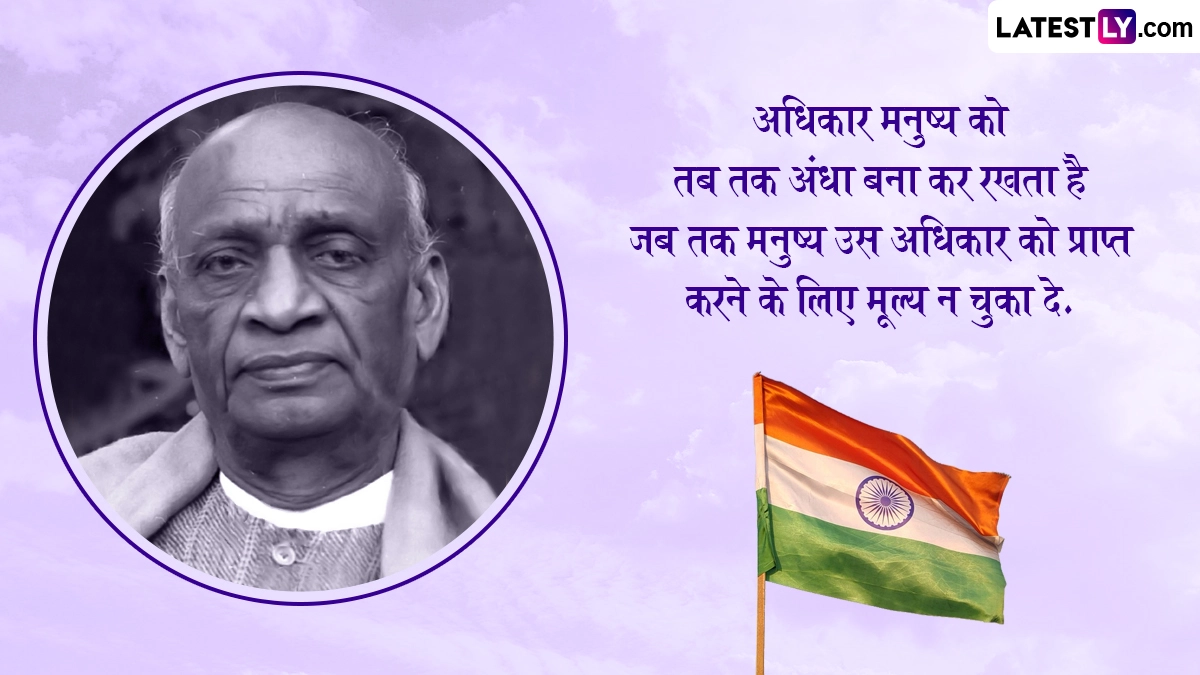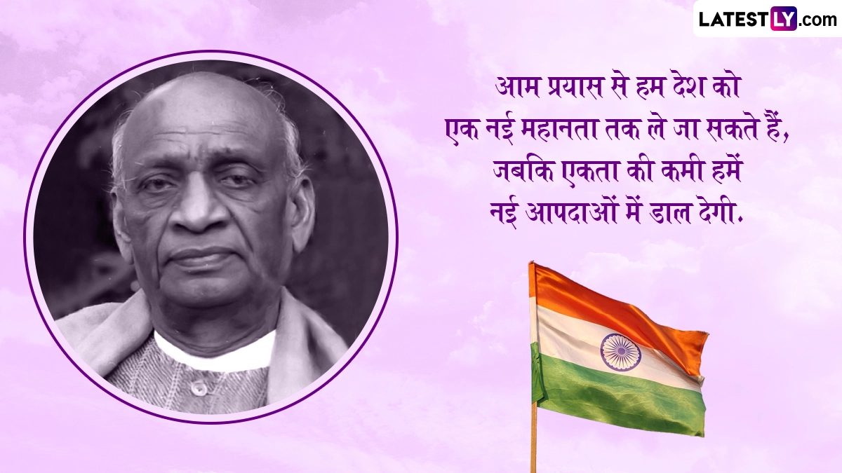 Sardar Patel Jayanti 2024 Quotes in Hindi: हर साल 31 अक्टूबर को लौह पुरुष सरदार वल्लभभाई पटेल की जयंती (Sardar Vallabhbhai Patel Jayanti) देशभर में मनाई जाती है. भारत के पहले गृह मंत्री रहे सरदार पटेल (Sardar Vallabhbhai Patel) का जन्म 31 अक्टूबर 1875 को गुजरात (Gujarat) के नाडियाद में हुआ था. सरदार वल्लभभाई पटेल जयंती को हर साल राष्ट्रीय एकता दिवस (National Unity Day) के तौर पर मनाया जाता है. सरदार पटेल के पिता का नाम झावेर भाई और मां का नाम लाडबा पटेल था. वो अपने माता-पिता की चौथी संतान थे. दरअसल, भारत सरकार ने साल 2014 में 31 अक्टूबर यानी सरदार वल्लभ भाई पटेल के जन्मदिवस को राष्ट्रीय एकता दिवस के तौर पर मनाने का फैसला किया, तब से हर साल इस दिन को हर्षोल्लास से मनाया जाता है. इस दिन राजधानी दिल्ली में मुख्य समारोह आयोजित किया जाता है. इस दिन राष्ट्रीय एकता दिवस के प्रति जागरुकता बढ़ाने के लिए और सरदार पटेल की याद में 'रन फॉर यूनिटी' का आयोजन किया जाता है.