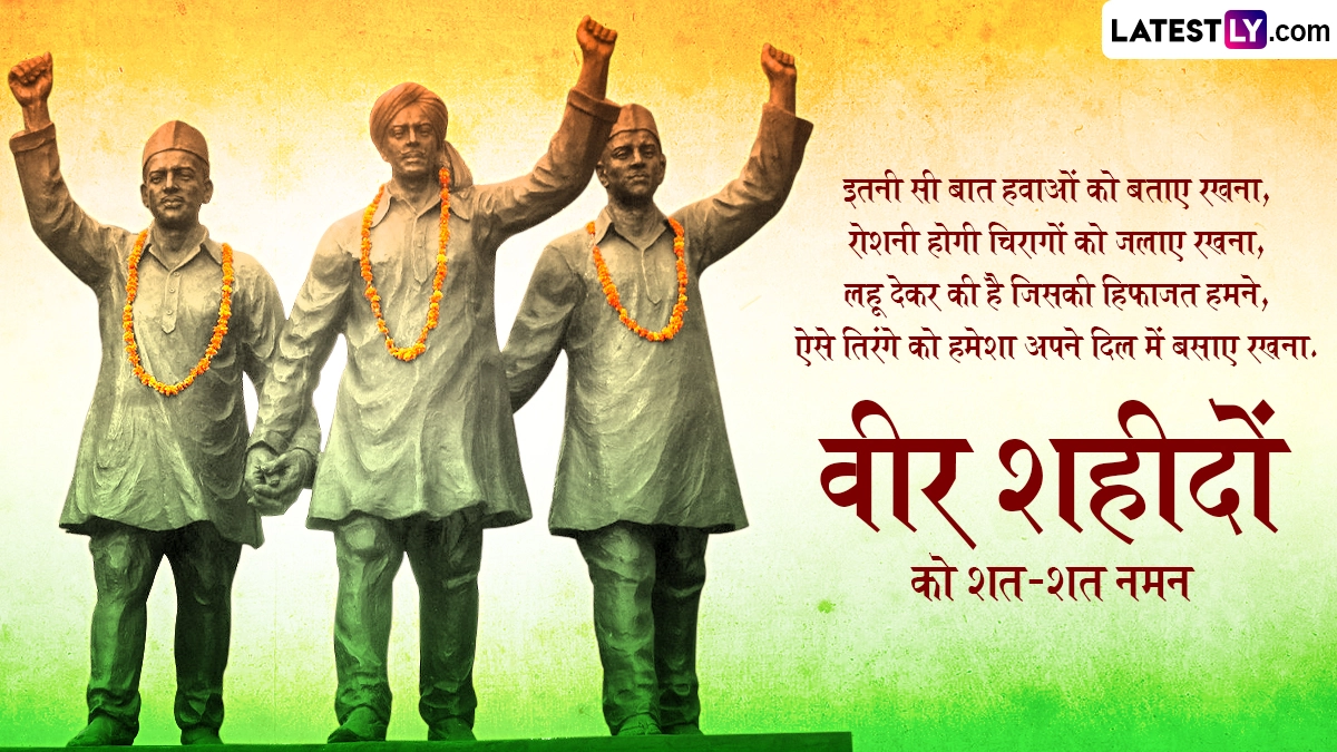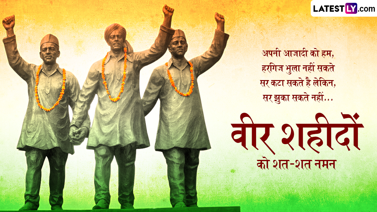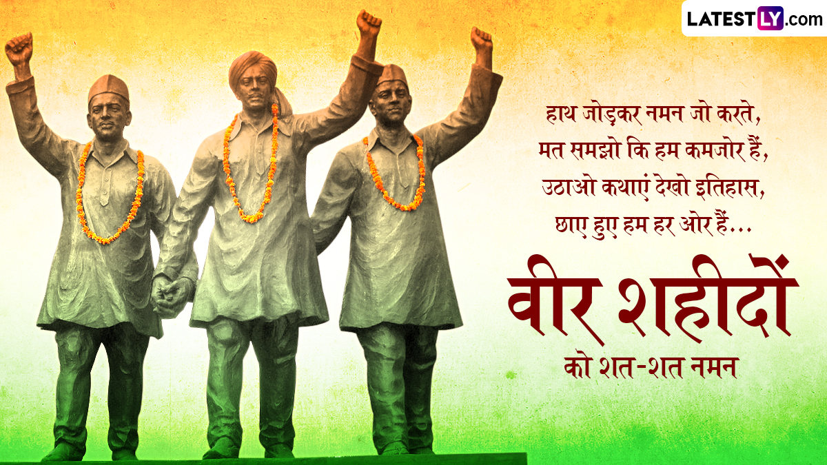 बहुत ही कम उम्र में भगत सिंह, राजगुरु और सुखदेव ने मातृभूमि के लिए अपने प्राणों का बलिदान कर दिया था. भारत माता के ये तीनों वीर सपूत आज भी देश की युवा पीढ़ी के लिए प्रेरणा स्रोत हैं, इसलिए 23 मार्च को शहीद दिवस पर इन वीरों के बलिदान को याद किया जाता है. ऐसे में आप इन हिंदी कोट्स, मैसेजेस, स्लोगन, वॉट्सऐप स्टिकर्स, जीआईएफ इमेजेस के जरिए वीर शहीदों को शत-शत नमन कर सकते हैं.