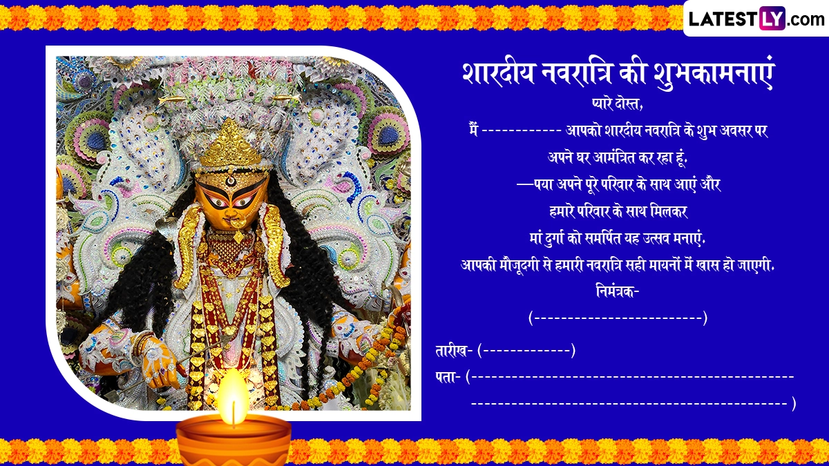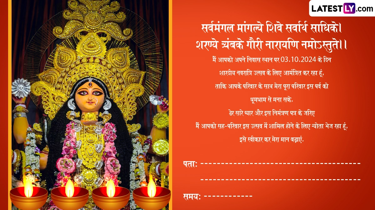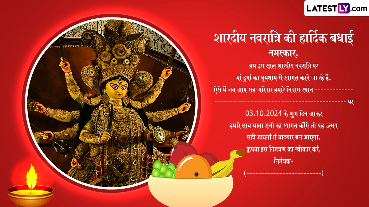 Sharad Navratri 2024 E-Invitation in Hindi: मां दुर्गा (Maa Durga) के भक्तों के लिए नवरात्रि (Navratri) का पर्व बेहद खास माना जाता है, क्योंकि नवरात्रि के नौ दिनों तक भक्त शक्ति स्वरूपा मां दुर्गा के नौ स्वरूपों की उपासना करते हैं. हर साल अश्विन मास के शुक्ल पक्ष की प्रतिपदा तिथि से शारदीय नवरात्रि (Sharad Navratri) की शुरुआत होती है, जबकि अश्विन शुक्ल नवमी को इसका समापन होता है और अगले दिन यानी अश्विन शुक्ल दशमी को विजयादशमी (Vijayadashami) का त्योहार मनाया जाता है. इस साल शारदीय नवरात्रि की शुरुआत 3 अक्टूबर 2024 से कलश स्थापना के साथ हो रही है. इस दिन से घरों और पूजा पंडालों में दुर्गा सप्तशती का पाठ आरंभ हो जाएगा, फिर 11 अक्टूबर को महानवमी और 12 अक्टूबर को विजयादशमी मनाई जाएगी.
