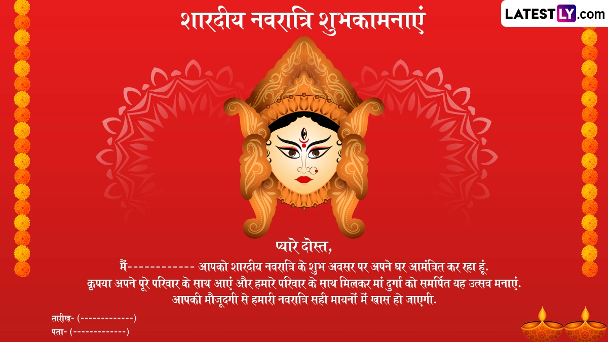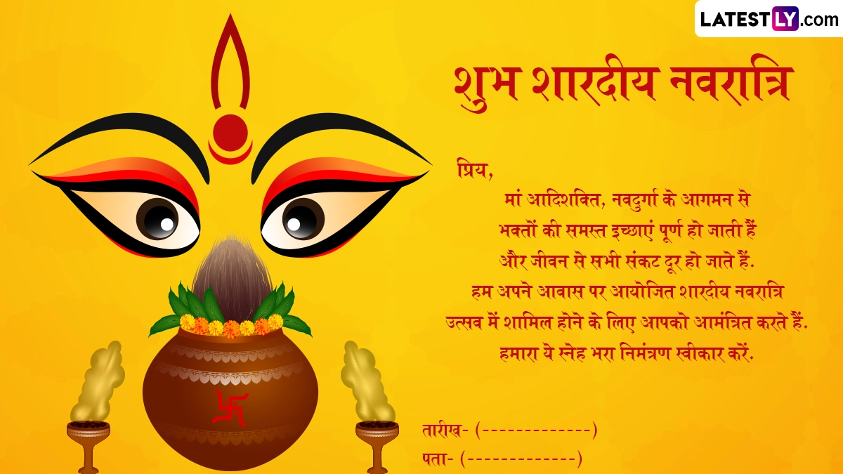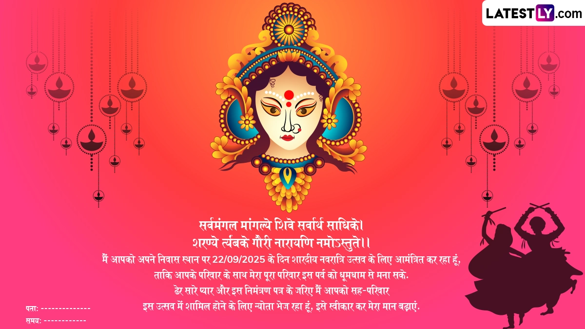 Sharad Navratri 2025 E-Invitation Format: आदिशक्ति जगदंबा मां दुर्गा (Maa Durga) के भक्तों के लिए नौ दिवसीय नवरात्रि (Navratri) का उत्सव बेहद खास माना जाता है. नवरात्रि के दौरान नौ दिनों तक भक्त व्रत रखकर विधि-विधान से मां दुर्गा के नौ स्वरूपों की उपासना करते हैं. चैत्र नवरात्रि के बाद भक्त आश्विन मास में शारदीय नवरात्रि (Sharad Navratri) का पर्व धूमधाम से मनाते हैं, जिसकी शरुआत आश्विन शुक्ल प्रतिपदा से घटस्थापना (Ghatsthapana) के साथ होती है और समापन आश्विन शुक्ल नवमी को महा नवमी व कन्या पूजन के साथ होता है, फिर उसके अगले दिन विजयादशमी (Vijayadashami) यानी दशहरे (Dussehra) का त्योहार मनाया जाता है. इस साल 22 सितंबर 2025 से शारदीय नवरात्रि की शुरुआत हो रही है और 2 अक्टूबर 2025 को विजयदशमी मनाई जाएगी.
