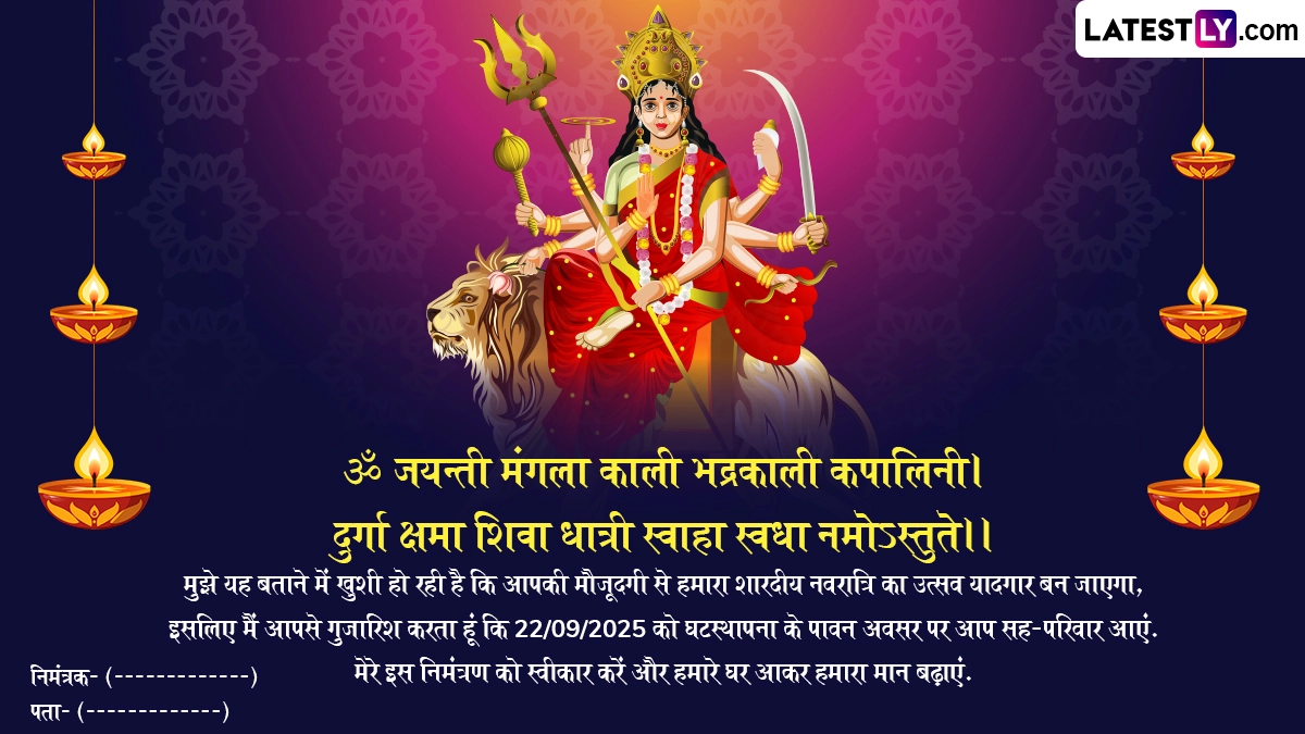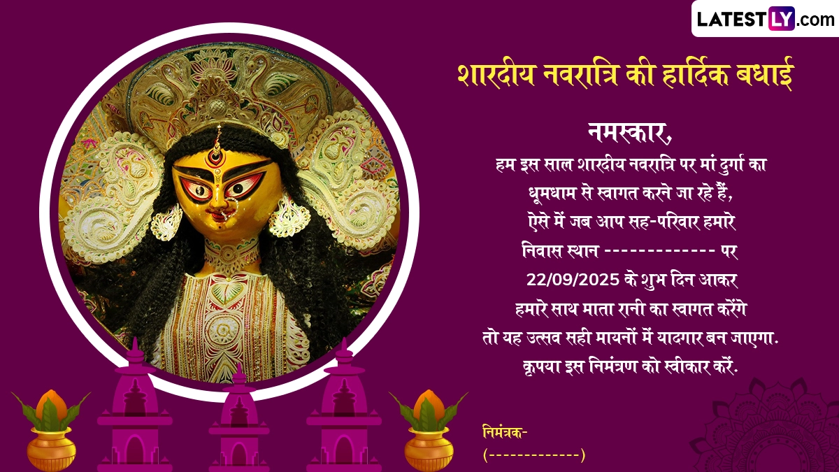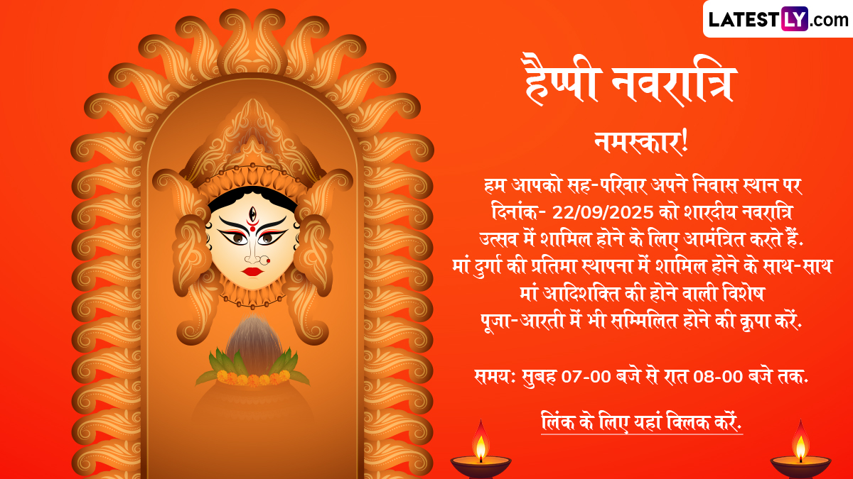 Sharad Navratri 2025 E-Invitation In Hindi: आश्विन मास की अमावस्या यानी सर्वपितृ अमावस्या (Sarv Pitru Amavasya) के दिन पितरों को विदाई देने के बाद भक्त मां दुर्गा (Maa Durga) के स्वागत के लिए तैयार हो जाते हैं, क्योंकि इसके अगले ही दिन यानी आश्विन शुक्ल प्रतिपदा से मां दुर्गा की उपासना के नौ दिवसीय पर्व शारदीय नवरात्रि (Sharad Navratri) की शुरुआत हो जाती है, जिसका मां भगवती के उपासकों को बेसब्री से इंतजार रहता है. हिंदू पंचांग के अनुसार, अश्विन शुक्ल प्रतिपदा से शारदीय नवरात्रि की शुरुआत होती है और अश्विन शुक्ल नवमी को महानवमी के साथ नौ दिवसीय नवरात्रि का समापन होता है, जबकि उसके अगले दिन विजयादशमी (Vijayadashami) यानी दशहरे (Dussehra) का त्योहार मनाया जाता है. इस साल 22 सितंबर 2025 से शारदीय नवरात्रि की शुरुआत हो रही है, जबकि महानवमी 1 अक्टूबर 2025 को होगी और 2 अक्टूबर 2025 को विजयादशमी का पर्व मनाया जाएगा.