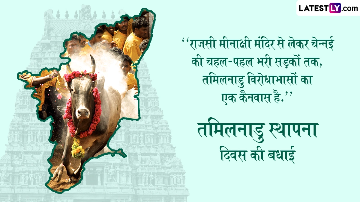 हमें उम्मीद है कि आपको अपने दोस्तों, परिवार और रिश्तेदारों को खुश करने के लिए लेटेस्ट तमिलनाडु 2024 शुभकामनाएं और संदेश खोजने में कोई परेशानी नहीं होगी, यहां लेटेस्ट संग्रह के साथ हम, LatestLY पर, आपके लिए कुछ सबसे अद्भुत और लोकप्रिय तमिलनाडु दिवस संदेश लेकर आए हैं, जिन्हें आप अपने प्रियजनों के साथ साझा करना पसंद करेंगे. हम आप सभी को तमिलनाडु दिवस 2024 की हार्दिक शुभकामनाएं देते हैं!