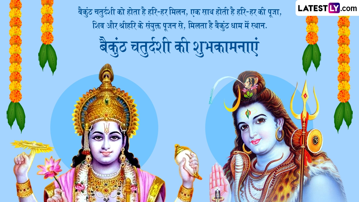 बैकुंठ चतुर्दशी साल का एक ऐसा दिन होता है, जब योगनिद्रा से बाहर आए भगवान विष्णु को भगवान शिव से संसार के संचालन का कार्य दोबारा मिलता है. इस दिन व्रत रखकर हरि-हर की पूजा करने से भक्तों के सभी मनोरथ पूर्ण होते हैं. ऐसे में इस पावन अवसर पर आप इन हिंदी मैसेजेस, वॉट्सऐप विशेज, फेसबुक ग्रीटिंग्स, कोट्स के जरिए अपनों को बैकुंठ चतुर्दशी की शुभकामनाएं दे सकते हैं.