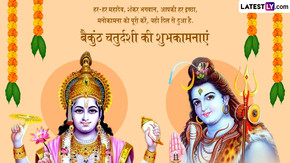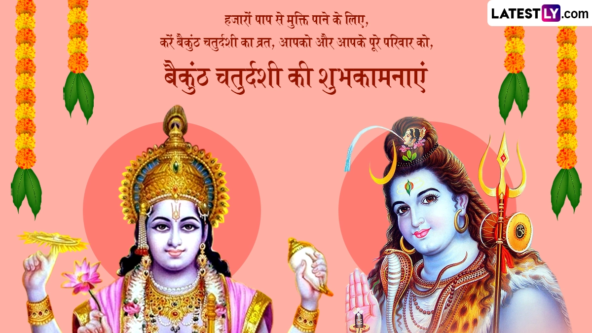 Vaikuntha Chaturdashi 2025 Messages in Hindi: दीपावली (Deepawali) यानी लक्ष्मी पूजन (Lakshmi Pujan) के 15 दिन बाद हर साल कार्तिक मास की पूर्णिमा तिथि को देव दीपावली का त्योहार मनाया जाता है, लेकिन उससे ठीक एक दिन पहले यानी कार्तिक मास के शुक्ल पक्ष की चतुर्दशी को बैकुंठ चतुर्दशी (Baikuntha Chaturdashi) या वैकुंठ चतुर्दशी (Vaikuntha Chaturdashi) का पर्व मनाया जाता है. इस साल 4 नवंबर 2025 को बैकुंठ चतुर्दशी मनाई जा रही है. यह पर्व वैकुंठाधिपति भगवान विष्णु (Bhagwan Vishnu) और देवों के देव महादेव (Mahadev) को समर्पित है. इस दिन हरि-हर यानी भगवान विष्णु और भगवान शिव की संयुक्त पूजा की जाती है. बैकुंठ चतुर्दशी का नाम भगवान विष्णु के दिव्य निवास स्थान, वैकुंठ धाम से लिया गया है. ऐसी मान्यता है कि इस दिन जो भी व्यक्ति व्रत रखकर भगवान विष्णु और भगवान शिव की पूजा करता है, उसे पापों से मुक्ति मिलती है और मृत्यु के बाद बैकुंठ धाम में स्थान प्राप्त होता है.