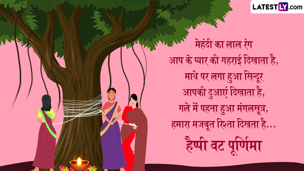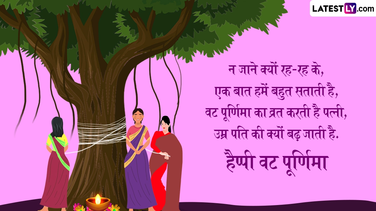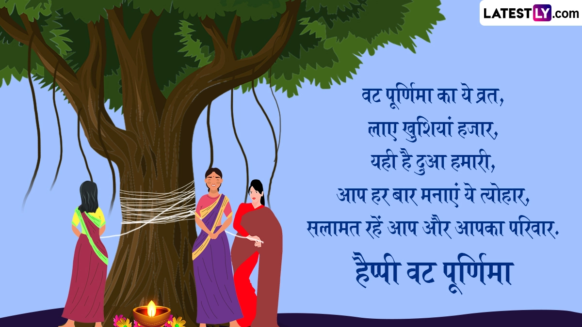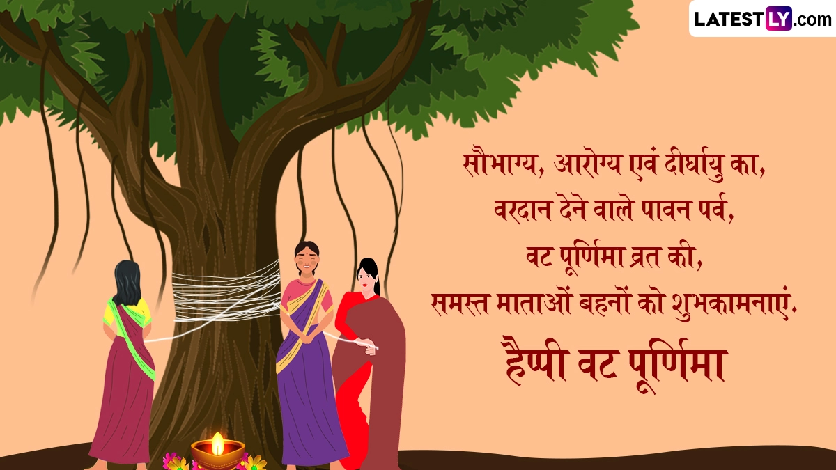 वट पूर्णिमा के दिन विवाहित महिलाएं अपने पति की लंबी उम्र की कामना से व्रत रखकर वट वृक्ष की पूजा करती हैं. पूजन के दौरान सत्यवान और सावित्री की कथा सुनी जाती है. पूजन के दौरान महिलाएं अपने पति की दीर्घायु की कामना करती हैं और इसकी शुभकामनाएं दी जाती हैं. ऐसे में इस अवसर पर आप इन हिंदी मैसेजेस, वॉट्सऐप विशेज, जीआईएफ ग्रीटिंग्स, शायरी और फोटो एसएमएस के जरिए प्रियजनों से हैप्पी वट पूर्णिमा कह सकते हैं.
