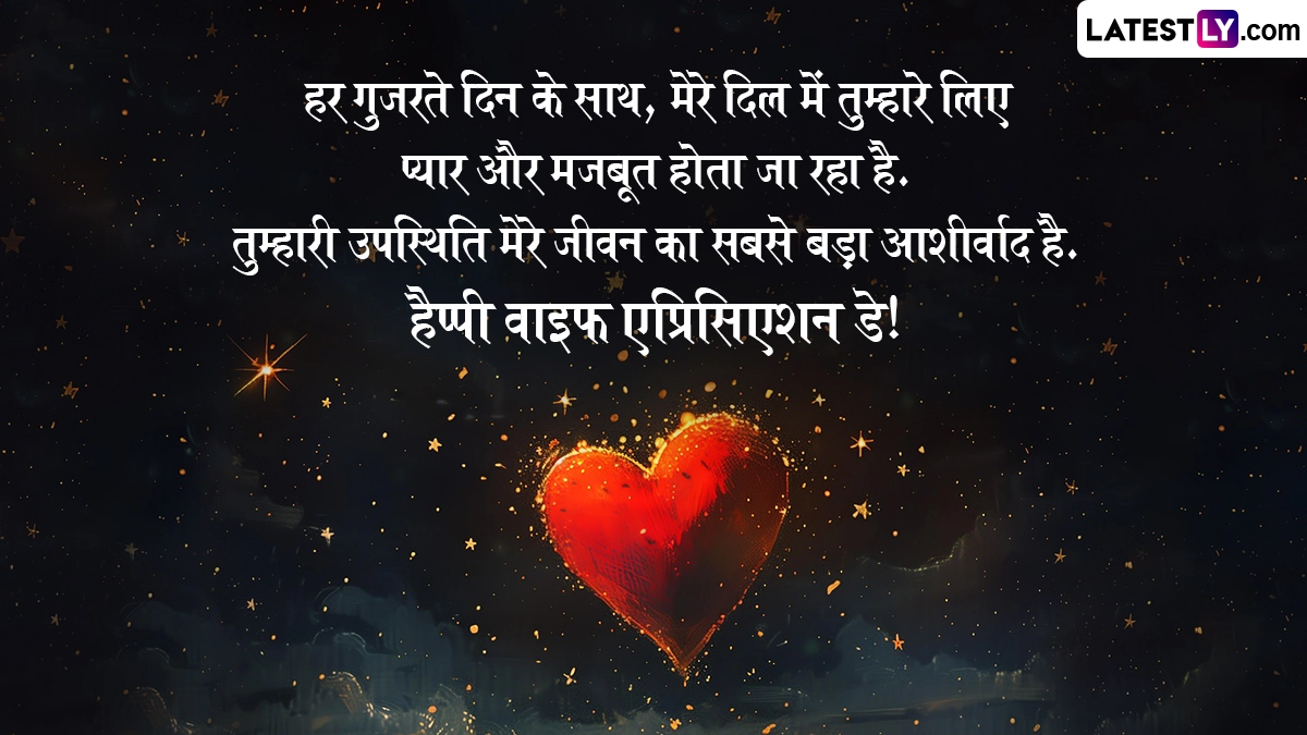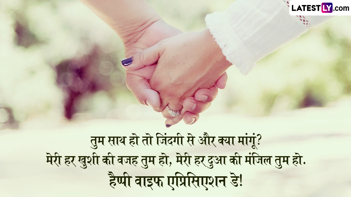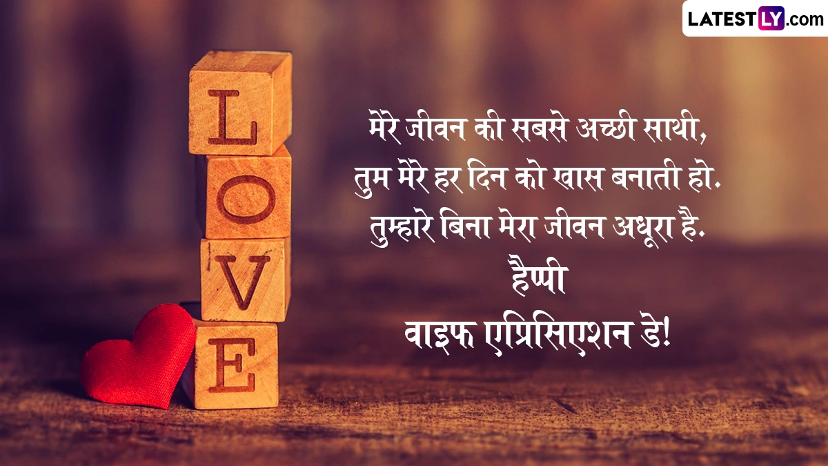 वाइफ एप्रिसिएशन डे पत्नियों के प्रति आभार जताने, उनके योगदान, सपनों और बलिदानों को पहचानने व उन्हें स्पेशल फील कराने का अवसर है. यह दिन याद दिलाता है कि अपनी पत्नी की सराहना करना और उनसे प्यार जताना बेहद जरूरी है. ऐसे में वाइफ एप्रिसिएशन डे के इस खास अवसर पर आप इन प्यार भरे विशेज, कोट्स, वॉट्सऐप मैसेजेस, जीआईएफ ग्रीटिंग्स के जरिए पत्नी की प्रशंसा कर सकते हैं.