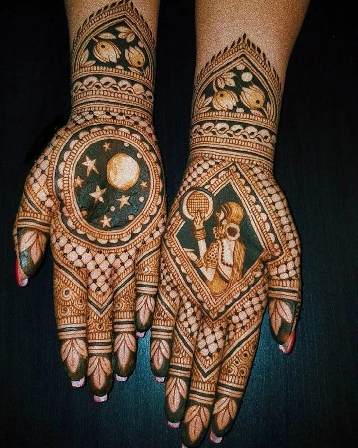 दिल, सितारे, और चांद जैसे प्रतीकों का उपयोग करके बने डिज़ाइन करवा चौथ की विशेषता को और बढ़ा देते हैं.