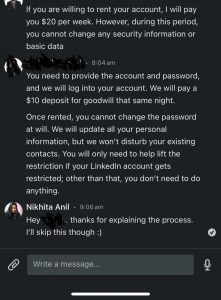 उस व्यक्ति ने प्रस्ताव रखा कि निकिता को उनकी LinkedIn प्रोफाइल तक पहुंच देने के बदले हर सप्ताह $20 (करीब 1,600 रुपये) मिलेंगे. हालांकि, इस दौरान वे अपने सुरक्षा सेटिंग्स या व्यक्तिगत जानकारी में कोई बदलाव नहीं कर सकती थीं.