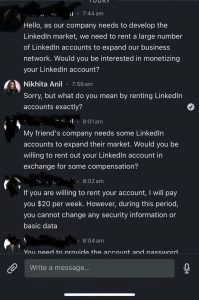 संदेश में लिखा था, "आपको केवल अकाउंट और पासवर्ड उपलब्ध कराना होगा, हम उसमें लॉगिन करेंगे. हम उसी रात आपको $10 की डिपॉजिट राशि भी देंगे. लेकिन, एक बार किराए पर देने के बाद, आप मनमाने ढंग से पासवर्ड नहीं बदल सकते. हम आपकी पूरी व्यक्तिगत जानकारी अपडेट करेंगे, लेकिन आपके मौजूदा संपर्कों को कोई नुकसान नहीं होगा. यदि आपका अकाउंट प्रतिबंधित हो जाता है, तो आपको उसे अनब्लॉक करने में मदद करनी होगी, इसके अलावा आपको कुछ नहीं करना होगा."