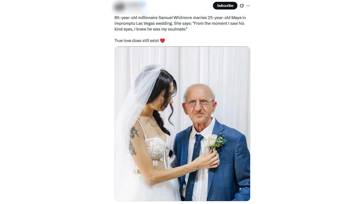 फैक्ट चेक: 85 साल के करोड़पति सैमुअल व्हिटमोर की 25 साल की माया से शादी की खबर है झूठी