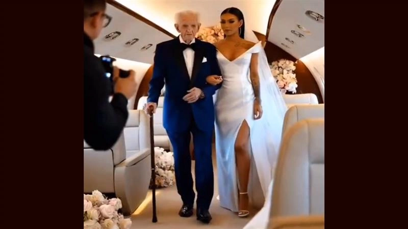 एक्स यूजर नोर्मा के (@realnorma_kay) ने इस कथित शादी का वीडियो साझा किया. उन्होंने लिखा, ‘फोटोग्राफर रॉबर्ट एनेजकुआ ने अपने 90 साल के दूल्हे और 25 साल की दुल्हन क्लाइंट्स की प्राइवेट जेट वेडिंग संभाली. उन्होंने बादलों के ऊपर अपनी कसमें खाईं. फोटोग्राफर के मुताबिक, यह पहली बार था जब उन्होंने ऐसी शादी देखी.’ यह भी पढ़ें: Fact Check: मुंबई में 'भारत की पहली पॉड टैक्सी सर्विस' दिखाने वाला वायरल वीडियो असली है या नकली? जानें ऑनलाइन सर्कुलेट हो रही क्लिप की सच्चाई