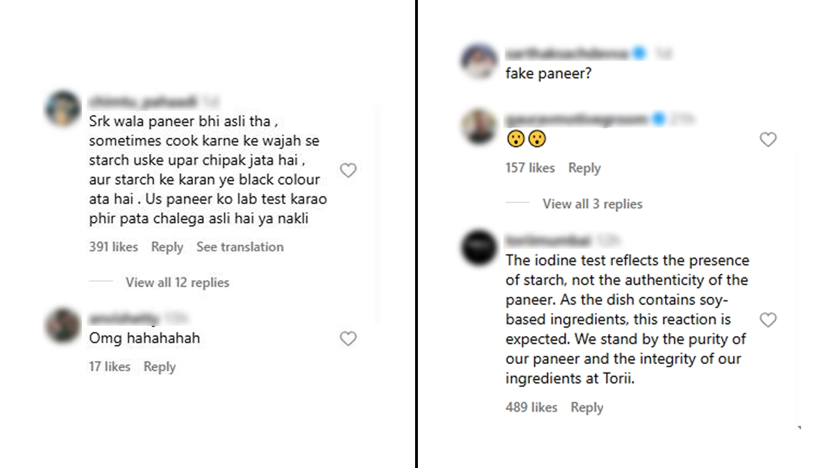 सार्थक के वीडियो के बाद 'टोरी' रेस्त्रां ने सोशल मीडिया पर अपनी प्रतिक्रिया दी है. रेस्त्रां की ओर से कहा गया, "आयोडीन टेस्ट स्टार्च की उपस्थिति को दिखाता है, न कि पनीर की असलियत को. हमारे व्यंजन में सोया आधारित सामग्री है, जिसकी वजह से आयोडीन का रिएक्शन हुआ है. हम अपने पनीर और अन्य सामग्री की शुद्धता पर पूरा भरोसा रखते हैं."