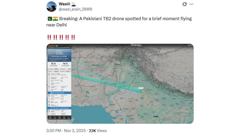Pakistani Drone in Delhi Fact Check: सोशल मीडिया पर वायरल हो रहे एक दावे से हड़कंप मचा हुआ है, जिसमें कहा गया है कि दिल्ली के पास एक पाकिस्तानी Bayraktar TB2 ड्रोन उड़ता हुआ देखा गया. 'एक्स यूजर' ने सबूत के तौर पर Flightradar24 का एक स्क्रीनशॉट भी शेयर किया, जिसमें 'TB2T1071' नाम का एक रहस्यमयी विमान दिखाई दे रहा था. जैसे ही यह पोस्ट वायरल हुई, लोग दिल्ली के हवाई क्षेत्र के उल्लंघन (Airspace Violations) को लेकर चिंतित हो गए.
