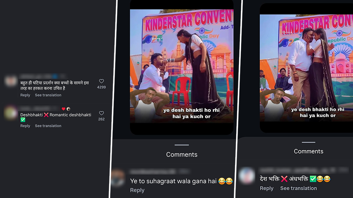 एक यूजर ने कमेंट करते हुए लिखा, ‘यह देशभक्ति हो रही है या कुछ और?’ वहीं एक अन्य यूजर ने नाराजगी जाहिर करते हुए लिखा, ‘यह कहीं से भी देशभक्त जैसा प्रदर्शन नहीं लग रहा है.’ अधिकांश लोग इस बात से खफा हैं कि राष्ट्रीय गौरव के गीतों का इस्तेमाल मनोरंजन और रील बनाने के लिए इस तरह से किया जा रहा है. यह भी पढ़ें: Tina Dabi Republic Day Video: गणतंत्र दिवस पर सलामी की दिशा को लेकर चर्चा में आईं आईएएस टीना डाबी; वीडियो वायरल होने पर दी सफाई, कहा- 'मानवीय भूल थी'