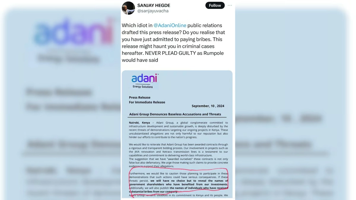 सुप्रीम कोर्ट के सीनियर वकील संजय हेगड़े ने हाल ही में एक फेक प्रेस रिलीज़ साझा की, जिसे उन्होंने बाद में हटा लिया. यह मामला सोशल मीडिया पर चर्चा का विषय बन गया जब उन्होंने अदानी ग्रुप से संबंधित एक मीडिया रिलीज़ को अपने X (पहले ट्विटर) अकाउंट पर पोस्ट किया. इस फेक दस्तावेज़ में अदानी ग्रुप पर केन्या में भ्रष्टाचार के आरोप लगाए गए थे और इसमें यह भी कहा गया था कि अगर विरोध जारी रहे तो कंपनी उन सरकारी शेयरधारकों के नाम उजागर करेगी जिन्होंने रिश्वत ली है.