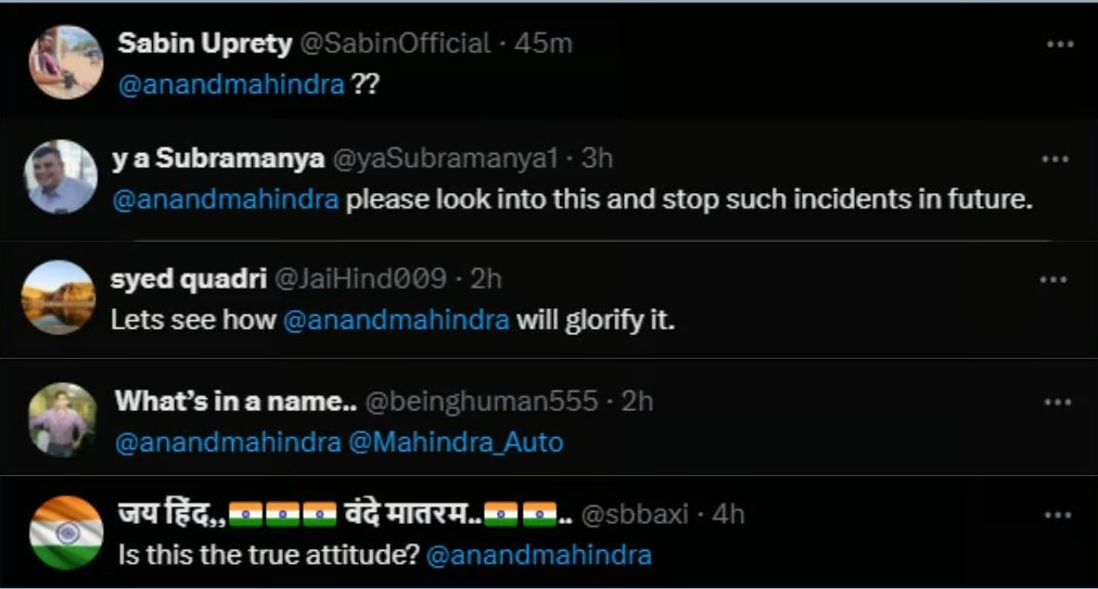 इसके अलावा, कई नेटिज़न्स ने महिंद्रा के चेयरपर्सन आनंद महिंद्रा को टैग करते हुए इस घटना पर ध्यान आकर्षित किया और कहा कि ऐसी घटनाओं को रोकने के लिए सख्त कदम उठाए जाने चाहिए.
