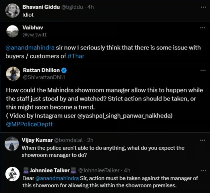 इस वीडियो के वायरल होते ही सोशल मीडिया पर लोग इस घटना की आलोचना करने लगे. लोगों ने कहा कि इस तरह की हरकत से समाज में गलत संदेश जा सकता है और इस पर सख्त कानूनी कार्रवाई की मांग की. एक उपयोगकर्ता ने कहा, "महिंद्रा शो रूम के मैनेजर को इस घटना को घटित होने देना बिल्कुल गलत था. इसके लिए उन्हें जिम्मेदार ठहराया जाना चाहिए."