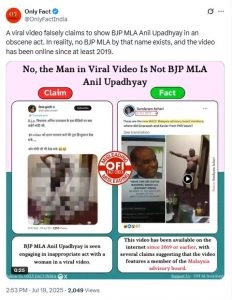 BJP MLA Anil Upadhyay Fake Video: सोशल मीडिया पर वायरल हो रहे एक वीडियो ने फिर से फेक न्यूज को जन्म दिया है. वीडियो में दावा किया जा रहा है कि बीजेपी विधायक अनिल उपाध्याय बंद कमरे में शराब और शबाब का लुत्फ उठा रहे हैं. कई लोगों ने बिना सोचे-समझे इसे शेयर करना शुरू कर दिया, लेकिन अब इस वीडियो की सच्चाई सामने आ गई है. इस वायरल वीडियो की गहराई से जांच करने पर पता चला कि बीजेपी विधायक अनिल उपाध्याय नाम का कोई व्यक्ति मौजूद ही नहीं है. यानी यह नाम ही फर्जी है. इतना ही नहीं, शेयर किया जा रहा वीडियो 2019 से इंटरनेट पर मौजूद है और इसका भारतीय राजनीति से कोई लेना-देना नहीं है.