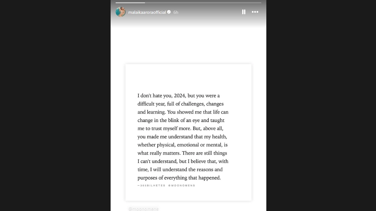 Malaika Arora Post: मलाइका अरोड़ा ने 2024 को एक कठिन वर्ष बताया है. उन्होंने सोशल मीडिया पर एक भावुक पोस्ट को रीपोस्ट किया जिसमें इस वर्ष के चुनौतियों और सीखों के बारे में बताया गया है. इस वर्ष मलाइका के लिए व्यक्तिगत रूप से काफी कठिन रहा है. उन्होंने अपने सौतेले पिता अनिल मेहता को खो दिया. इसके अलावा, उन्होंने अभिनेता अर्जुन कपूर से भी अलग होने का फैसला किया, जिसके साथ उनका छह साल का रिश्ता था.