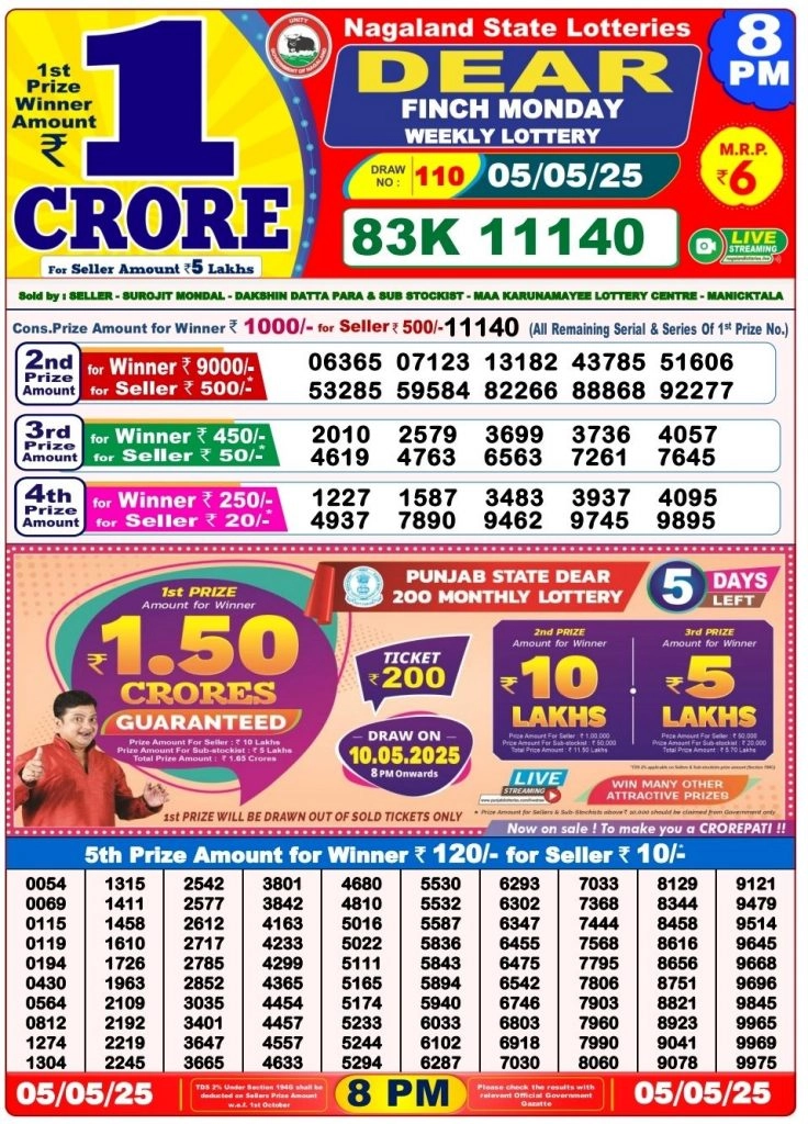 Nagaland Dear Lottery Sambad Result Today 8 PM: अगर आप भी लॉटरी के शौकीन हैं तो आज का दिन आपके लिए खास हो सकता है. नागालैंड स्टेट लॉटरी की Dear Dwarka Monday Lottery Sambad का रिजल्ट आज यानी 5 मई को रात 8 बजे घोषित कर दिया गया है. यह ऑफलाइन पेपर लॉटरी है, जिसमें पहले इनाम के तौर पर 1 करोड़ रुपये तक की रकम जीतने का मौका मिलता है. नागालैंड राज्य सरकार की ओर से संचालित इस लॉटरी को देशभर के कई लोग खेलते हैं, क्योंकि भारत के 13 राज्यों में लॉटरी वैध है, जिनमें नागालैंड, केरल, महाराष्ट्र, पश्चिम बंगाल, पंजाब और असम जैसे राज्य शामिल हैं.