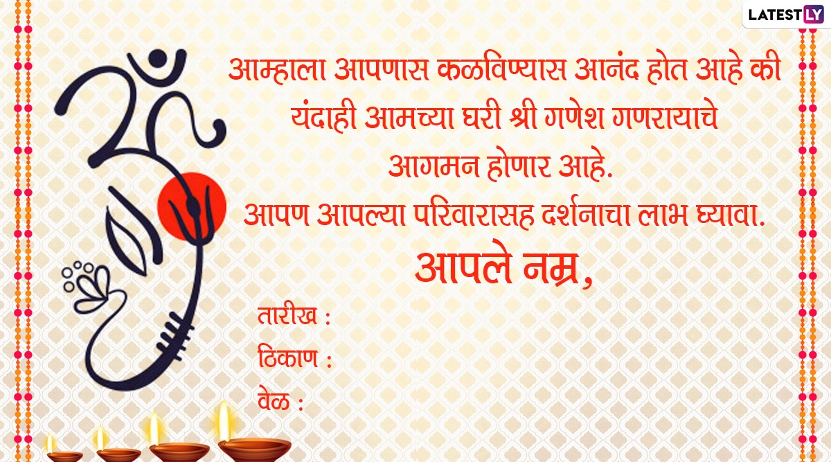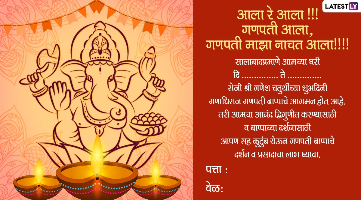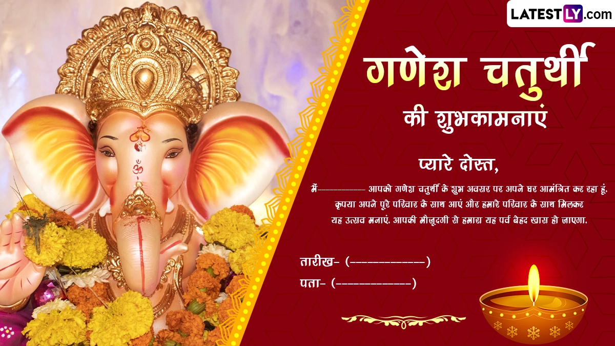 Ganesh Chaturthi 2024 Invitation Cards: गणेश चतुर्थी (Ganesh Chaturthi 2024), जिसे विनायक चतुर्थी (Vinayak Chaturthi) या विनायक चविथी के नाम से भी जाना जाता है, एक व्यापक रूप से मनाया जाने वाला हिंदू त्यौहार है. यह त्यौहार दुनिया भर में हिंदू समुदाय द्वारा मनाया जाता है. यह विशेष रूप से महाराष्ट्र राज्य में बड़े पैमाने पर मनाया जाता है. गणेश चतुर्थी भगवान गणेश की जयंती का प्रतीक है, जिन्हें बुद्धि, ज्ञान का देवता माना जाता है. भक्तों द्वारा निभाई जाने वाली एक प्रमुख परंपरा भगवान गणेश की मूर्ति को घर लाना है. फिर दोस्तों और परिवार को दर्शन के लिए आमंत्रित किया जाता है. यदि आप गणेश चतुर्थी 2024 निमंत्रण कार्ड, गणपति दर्शन निमंत्रण कार्ड टेम्प्लेट, या गणेश चतुर्थी 2024 आमंत्रण कार्ड की तलाश कर रहे हैं, तो आप सही जगह पर आए हैं! यह भी पढ़ें: Ganesh Chaturthi 2024: घर लाएं गणपति बप्पा, भोग चढ़ाएं स्वादिष्ट पिस्ता मोदक! घर पर खुद बनाएं आसान विधि से पिस्ता मोदक!