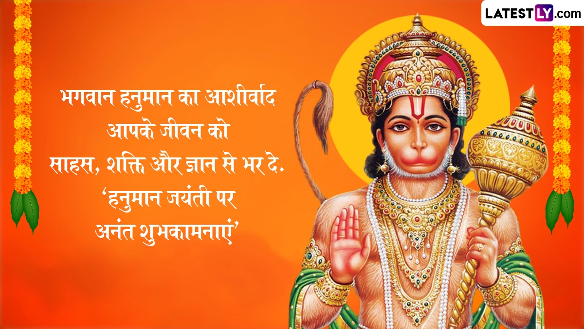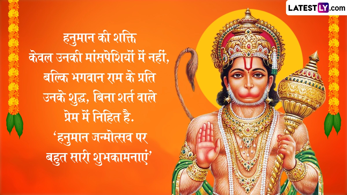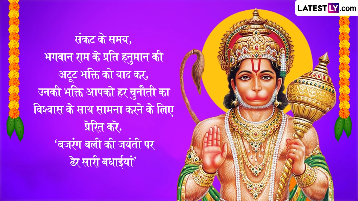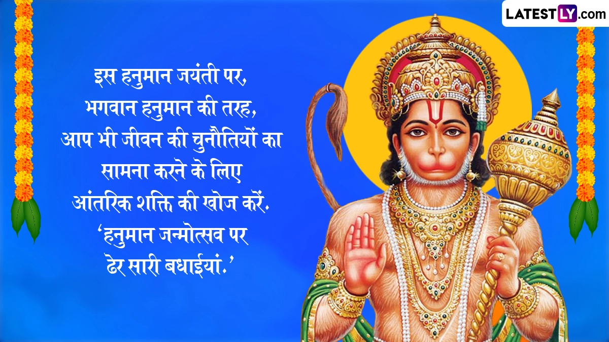 Spiritual Quotes on Hanuman Jayanti 2025: सनातन धर्म में हनुमान जयंती का विशेष महत्व है. हिंदू धर्म ग्रंथों के अनुसार चैत्र पूर्णिमा के दिन मां अंजना के गर्भ से हनुमान जी पैदा हुए थे, इसलिए उन्हें आंजनेय कहा जाता है. हनुमान जी के पिता का नाम केसरी था. श्रीराम के प्रति अटूट भक्ति और महाबली के रूप में विख्यात हनुमान जी को साहस, निस्वार्थ सेवा और भक्ति के प्रतीक के रूप में जाना जाता है. देश भर में हिंदू धर्म के लोग हनुमान जयंती बड़ी धूमधाम से मनाई जाती है. इस वर्ष हनुमान जयंती 12 अप्रैल 2025, शनिवार को मनाई जाएगी. इस दिवस को सेलिब्रेट करने हेतु यहां कुछ कोट्स दिये गये हैं. अपने शुभचिंतकों, इष्ट मित्रों एवं सगे-संबंधियों को ये कोट्स भेजकर हनुमान जयंती सेलिब्रेट करें. यह भी पढ़ें: Hanuman Jayanti 2025: कब है हनुमान जयंती? जानें विभिन्न क्षेत्रों में अलग-अलग तिथियों में क्यों मनाई जाती है हनुमान जयंती?
