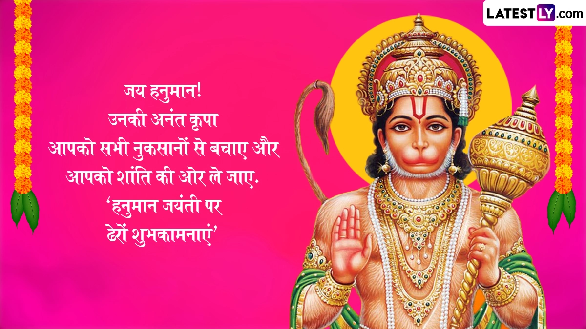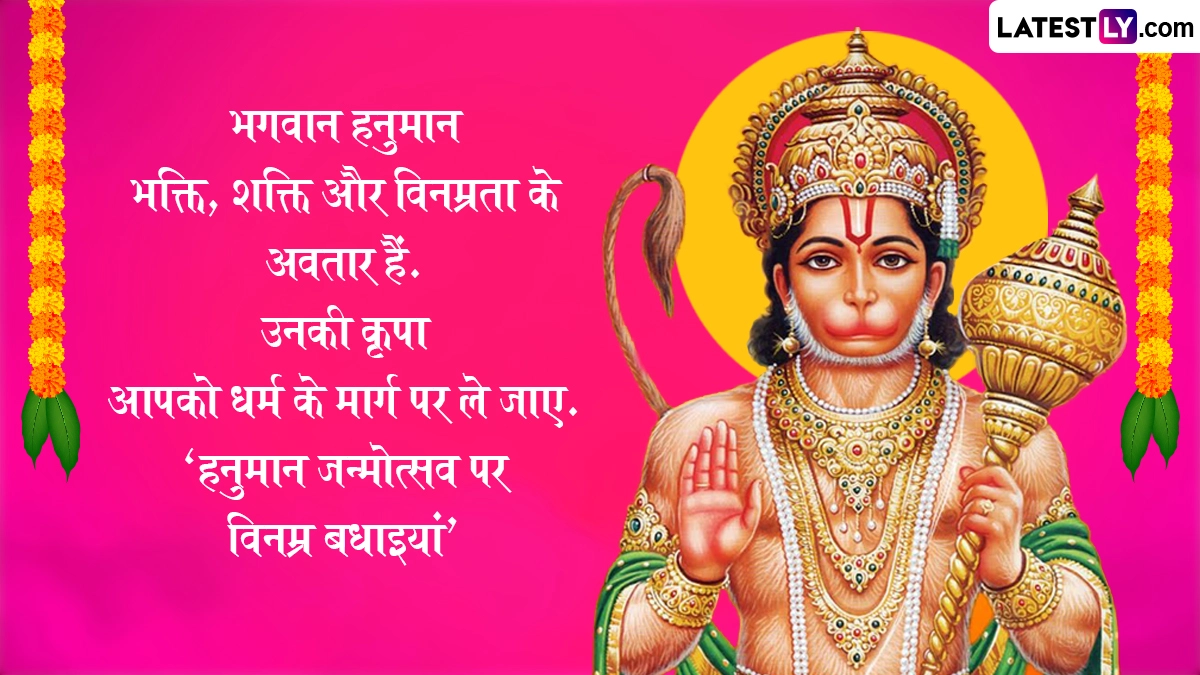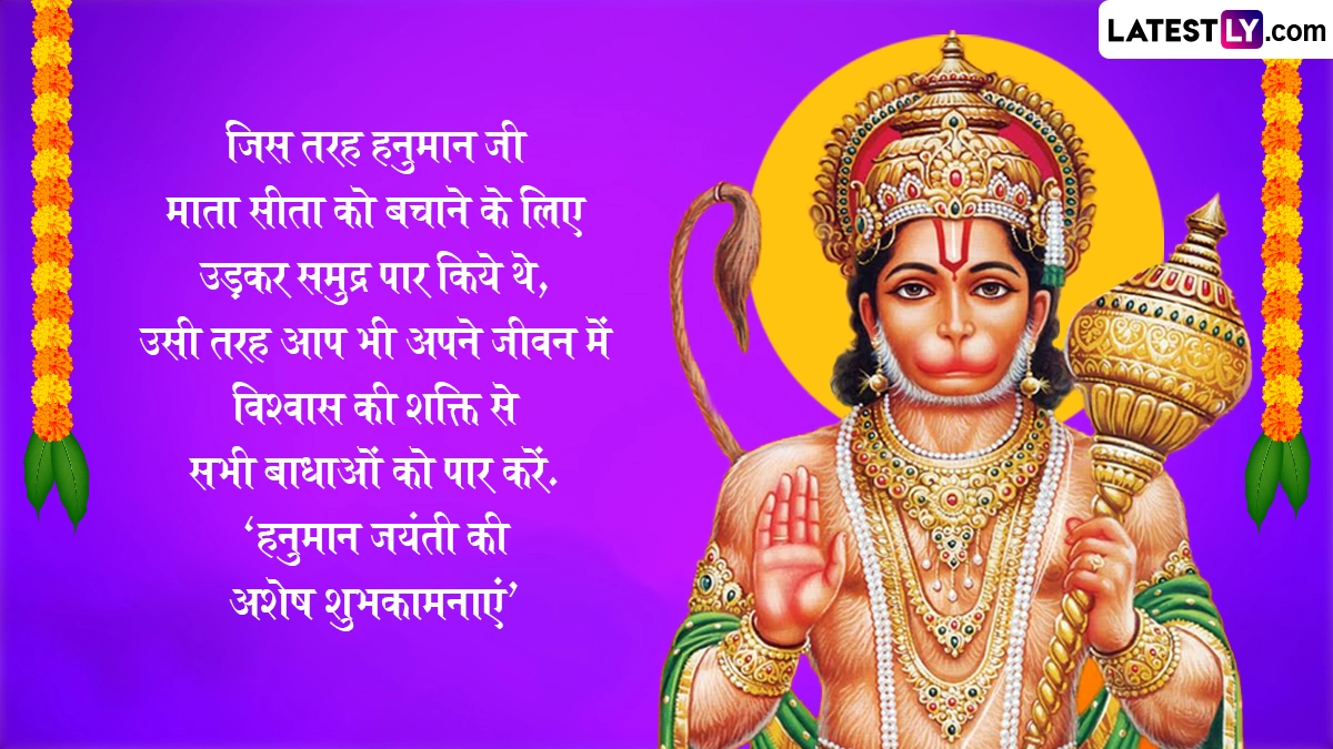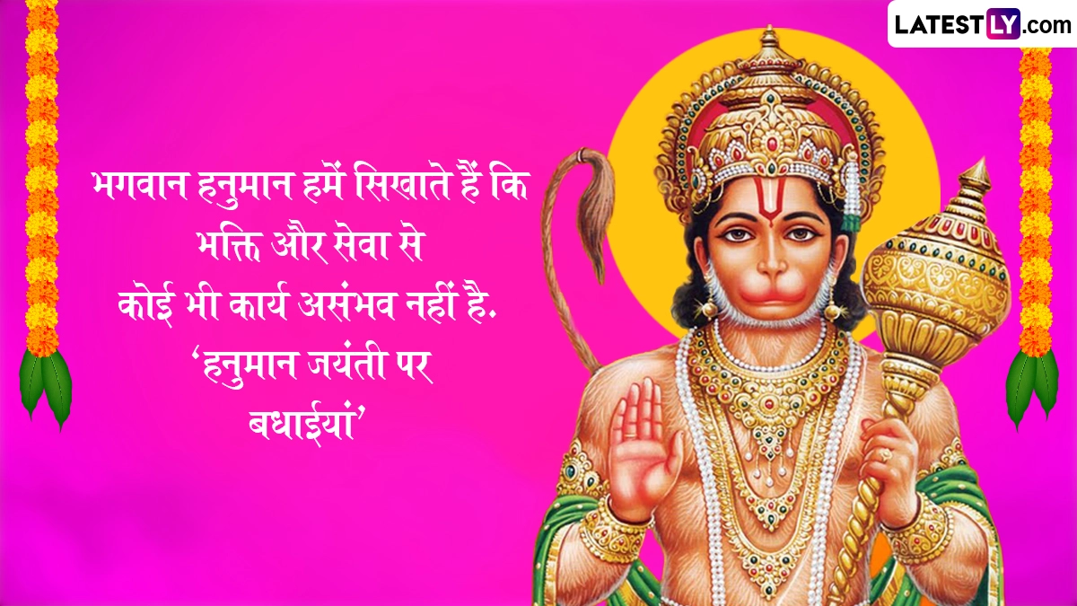 Spiritual Quotes on Hanuman Jayanti 2025: सनातन धर्म में हनुमान जयंती का विशेष महत्व है. हिंदू धर्म ग्रंथों के अनुसार चैत्र पूर्णिमा के दिन मां अंजना के गर्भ से हनुमान जी पैदा हुए थे, इसलिए उन्हें आंजनेय कहा जाता है. हनुमान जी के पिता का नाम केसरी था. श्रीराम के प्रति अटूट भक्ति और महाबली के रूप में विख्यात हनुमान जी को साहस, निस्वार्थ सेवा और भक्ति के प्रतीक के रूप में जाना जाता है. देश भर में हिंदू धर्म के लोग हनुमान जयंती बड़ी धूमधाम से मनाई जाती है. इस वर्ष हनुमान जयंती 12 अप्रैल 2025, शनिवार को मनाई जाएगी. इस दिवस को सेलिब्रेट करने हेतु यहां कुछ कोट्स दिये गये हैं. अपने शुभचिंतकों, इष्ट मित्रों एवं सगे-संबंधियों को ये कोट्स भेजकर हनुमान जयंती सेलिब्रेट करें. यह भी पढ़ें: Hanuman Jayanti 2025: कब है हनुमान जयंती? जानें विभिन्न क्षेत्रों में अलग-अलग तिथियों में क्यों मनाई जाती है हनुमान जयंती?
