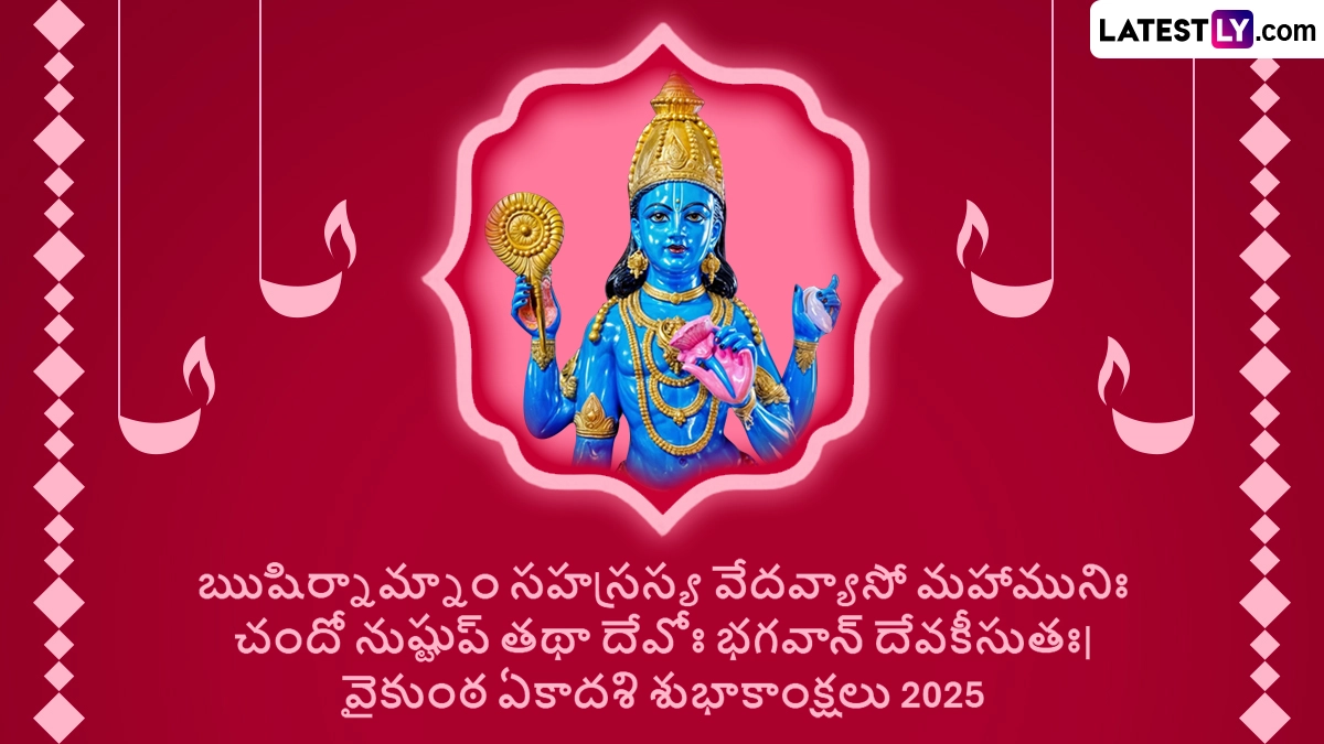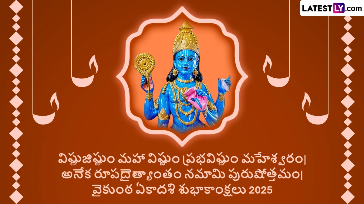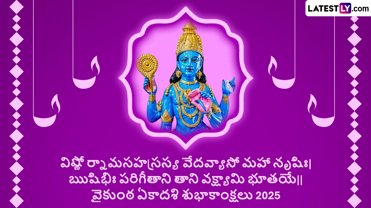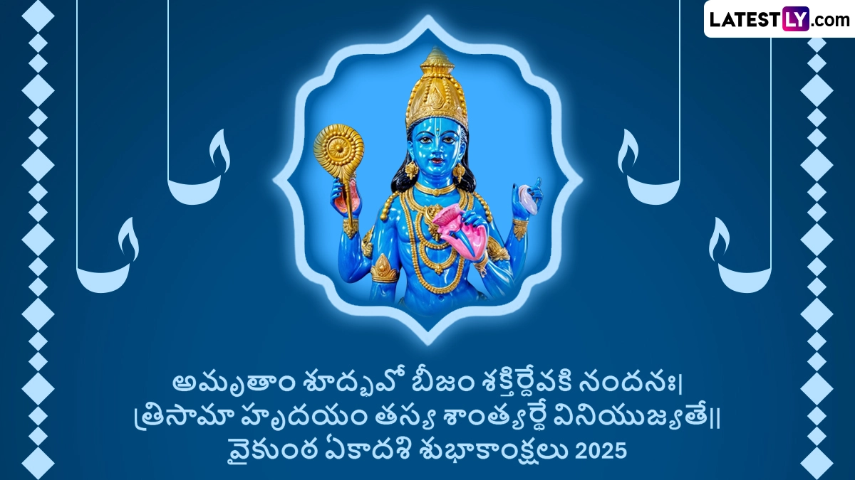 Vaikuntha Ekadasi 2025 Wishes In Telugu: हिंदू धर्म में एकादशी (Ekadashi) के व्रत को सभी व्रतों में उत्तम बताया गया है और यह तिथि भगवान विष्णु (Bhagwan Vishnu) को अत्यंत प्रिय है, इसलिए इस दिन व्रत रखकर भक्त भगवान विष्णु की विधि-विधान से पूजा-अर्चना करते हैं. आज (10 जनवरी 2025) नए साल की पहली एकादशी यानी वैकुंठ एकादशी (Vaikuntha Ekadashi) मनाई जा रही है. हिंदू पंचांग के अनुसार, पौष मास के शुक्ल पक्ष की एकादशी तिथि को वैकुंठ एकादशी का व्रत किया जाता है, जिसे बहुत फलदायी माना जाता है. ऐसी मान्यता है कि इस दिन व्रत रखकर श्रीहरि की पूजा करने से स्वर्ग लोग की प्राप्ति होती है. धार्मिक मान्यताओं के अनुसार वैकुंठ एकादशी स्वर्ग के दरवाजे खोलती है, इसलिए मनोकामना पूर्ति, मोक्ष की प्राति और जीवन की भौतिक सुख-सुविधाओं के लिए वैकुंठ एकादशी को बहुत ही महत्वपूर्ण माना जाता है. इस अवसर पर आप अपने प्रियजनों को इन शानदार विशेज, वॉट्सऐप स्टेटस, जीआईएफ ग्रीटिंग्स, कोट्स, मैसेजेस के जरिए तेलुगु में वैकुंठ एकादशी की शुभकामनाएं दे सकते हैं. यह भी पढ़ें: Vaikuntha Ekadashi 2025 Wishes: वैकुंठ एकादशी की इन हिंदी WhatsApp Messages और GIF Greetings भेजकर दें शुभकामनाएं