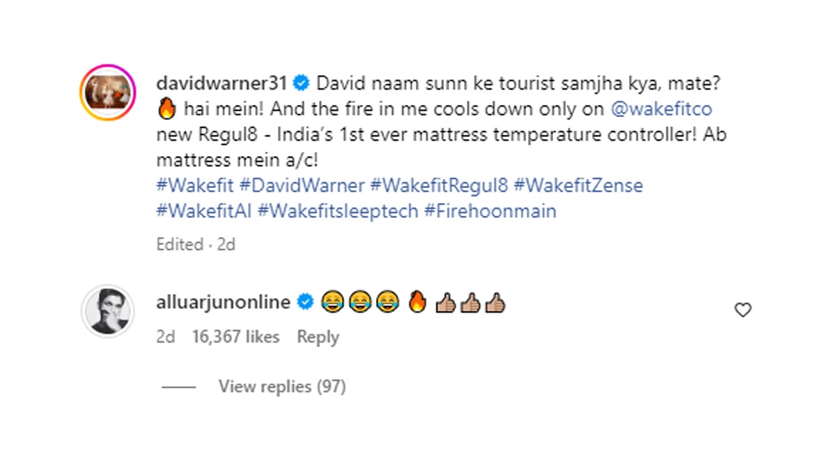 डेविड वॉर्नर ने एक विज्ञापन में पुष्पा राज की नकल करके प्रशंसकों को चकित कर दिया. यहां तक कि अल्लू अर्जुन भी क्रिकेटर के अपने प्रसिद्ध चरित्र के चित्रण से प्रभावित हुए, जिससे डेविड वार्नर की खूब प्रशंसा हुई. बता दें की इस साल की शुरुआत में, उन्होंने पुष्पा 2: द रूल के टीज़र के लिए अपनी उत्तेजना व्यक्त की. इसके अतिरिक्त, कुछ साल पहले, डेविड ने एक वीडियो साझा किया था जिसमें उन्होंने पुष्पा: द राइज़ के एक दृश्य में अर्जुन के चेहरे का इस्तेमाल करके रील बनाया था. अब, उन्होंने इंस्टाग्राम पर साझा किए गए एक नए विज्ञापन के साथ खुद को पीछे छोड़ दिया है, जिसने अल्लू अर्जुन और उनके दोनों के प्रशंसकों को हैरान कर दिया. इस विज्ञापन में, ऑस्ट्रेलियाई क्रिकेटर तेलुगु अभिनेता के लोकप्रिय चरित्र पुष्पा राज की नकल करते हुए दिखाई दे रहे हैं. जिस पर अल्लू अर्जुन ने भी मजेदार प्रतिक्रिया दी. नीचे आप पोस्ट देख सकतें हैं.
