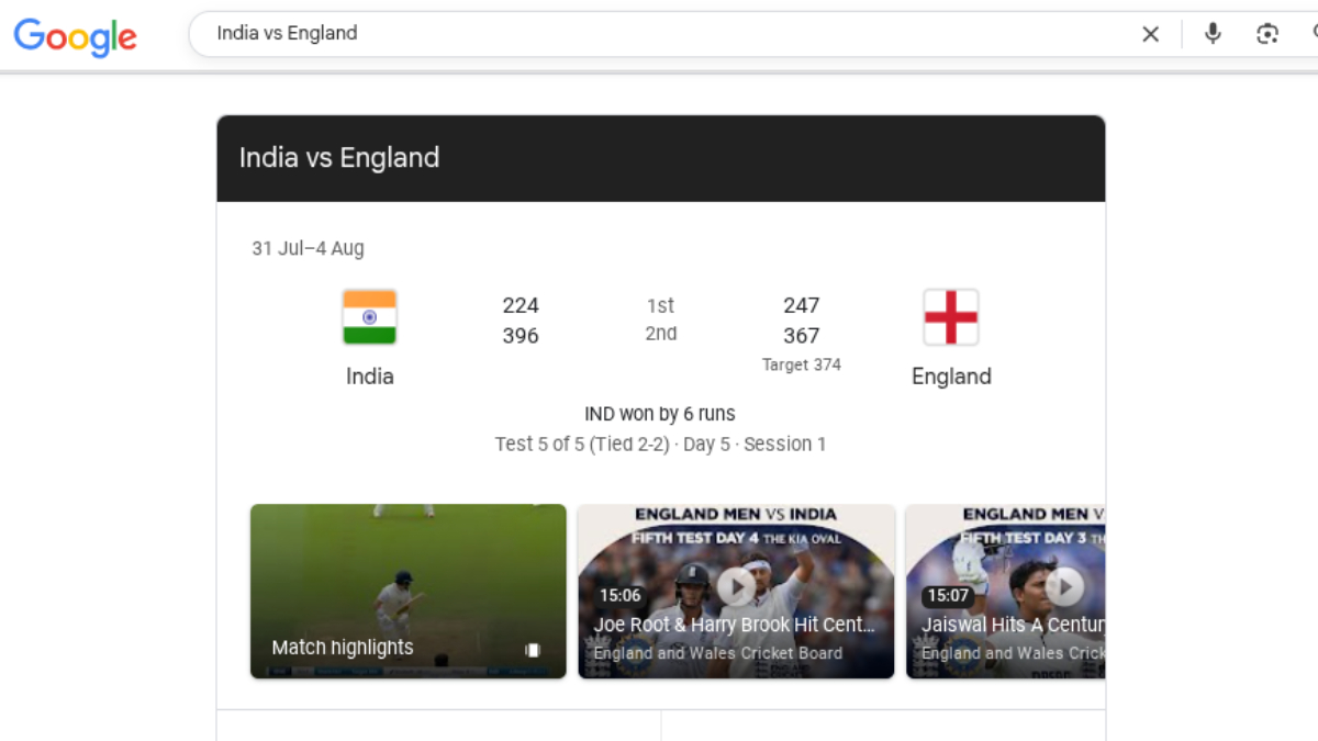 India National Cricket Team vs England National Cricket Team: भारतीय राष्ट्रीय क्रिकेट टीम बनाम इंग्लैंड राष्ट्रीय क्रिकेट टीम 5 मैचों की एंडरसन-तेंदुलकर ट्रॉफी 2025 टेस्ट सीरीज (Test Series) का पांचवां और आखिरी मुकाबला 31 जुलाई (बुधवार) से लंदन(London ) के केनिंग्टन ओवल(Kennington Oval) में खेला गया. जिसमें भारतीय गेंदबाज़ों ने शानदार प्रदर्शन करते हुए इंग्लैंड को लक्ष्य से महज़ 6 रन पहले ही रोक दिया. इस जीत के साथ युवा खिलाड़ियों और नए कप्तान के नेतृत्व में भारत ने 5 मैचों की टेस्ट सीरीज़ को 2-2 से बराबरी पर समाप्त किया. हालांकि इस ऐतिहासिक जीत के बाद एक अजीबोगरीब वाकया देखने को मिला. गूगल सर्च पर फायरवर्क्स एनिमेशन के जरिए इंग्लैंड को 'चैंपियन' घोषित कर दिया गया, जबकि सीरीज़ बराबरी पर खत्म हुई थी. इसे देखकर फैन्स हैरान रह गए और सोशल मीडिया पर अपनी नाराज़गी जताई. बाद में गूगल ने इस तकनीकी गड़बड़ी को ठीक कर लिया, लेकिन तब तक यह खबर वायरल हो चुकी थी.