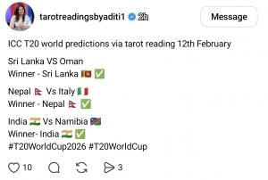 मुंबई: आईसीसी टी20 वर्ल्ड कप 2026 (ICC T20 World Cup 2026) को लेकर क्रिकेट फैंस के बीच रोमांच चरम पर है. आज तीन अहम मुकाबके खेले जाएंगे. पहला मुकाबला श्रीलंका राष्ट्रीय क्रिकेट टीम बनाम ओमान राष्ट्रीय क्रिकेट टीम के बीच सुबह 11 बजे से खेला जाएगा. दूसरा मुकाबला नेपाल राष्ट्रीय क्रिकेट टीम बनाम इटली राष्ट्रीय क्रिकेट टीम के बीच दोपहर 3 बजे से खेला जाएगा. वहीं, तीसरा मुकाबला भारतीय राष्ट्रीय क्रिकेट टीम बनाम नामिबिया राष्ट्रीय क्रिकेट टीम के बीच शाम 7 बजे से खेला जाएगा. इसी बीच मशहूर टैरो कार्ड रीडर अदिति ने आज के मैचों के लिए अपनी भविष्यवाणियां साझा की हैं.