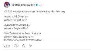 टैरो रीडिंग बाय अदिति द्वारा की गई यह भविष्यवाणी सोशल मीडिया प्लेटफॉर्म्स पर चर्चा का विषय बनी हुई है. हालांकि मैच का अंतिम परिणाम मैदान पर खिलाड़ियों के प्रदर्शन पर ही निर्भर करेगा.