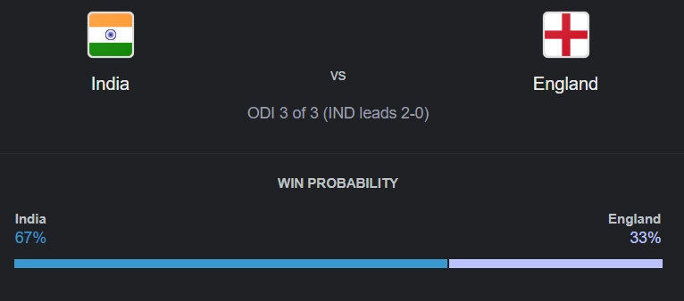 भारत तीसरे वनडे में इंग्लैंड के खिलाफ फेवरेट के रूप में उतरेगा, क्योंकि हाल ही में उनके प्रदर्शन में इंग्लैंड के खिलाफ शानदार जीत रही है. पहले दो मैचों में भारत ने बेहतरीन प्रदर्शन किया. भारत के गेंदबाजों ने भी अच्छा प्रदर्शन किया. इंग्लैंड ने संघर्ष जरूर किया, लेकिन उनके गेंदबाजी इकाई को सुधारने की जरूरत है अगर वे श्रृंखला में वापसी करना चाहते हैं. घरेलू परिस्थितियों में भारत के पक्ष में होते हुए और उनकी टीम अच्छे फॉर्म में है, तीसरे वनडे में भारत मजबूत पक्ष है. भारत और इंग्लैंड के बीच तीसरे वनडे में भारत को जीत का 67% चांस है, जबकि इंग्लैंड की जीत की संभावना 33% है. इंग्लैंड को तीसरे वनडे में वापसी के लिए अपनी गेंदबाजी और टीम की रणनीतियों में सुधार करना होगा.