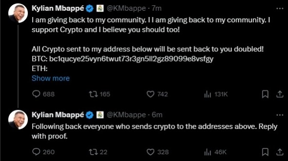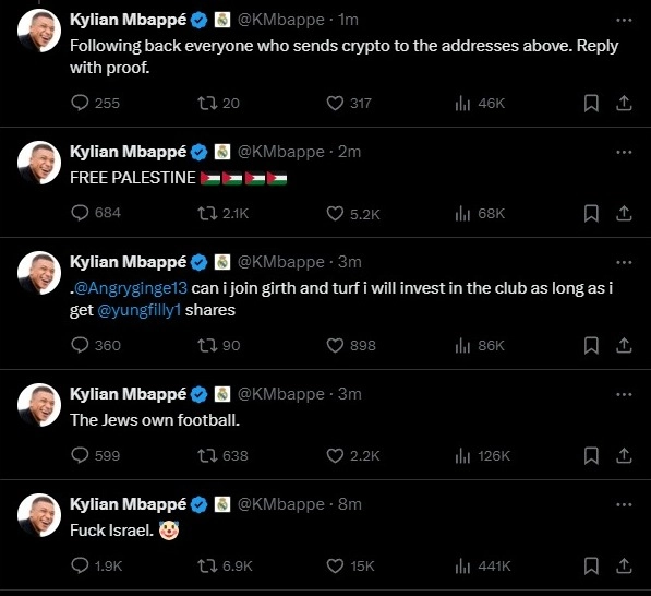 हैकर्स ने एम्बाप्पे के आधिकारिक X अकाउंट पर फुटबॉल से संबंधित राय, इज़राइल और फिलिस्तीन पर विचार, और एक संभावित क्रिप्टो स्कैम जैसी पोस्ट डाल दीं. ये पोस्ट अब हटा दी गई हैं, लेकिन यह जानना दिलचस्प है कि हैकर्स ने क्या-क्या पोस्ट किया-