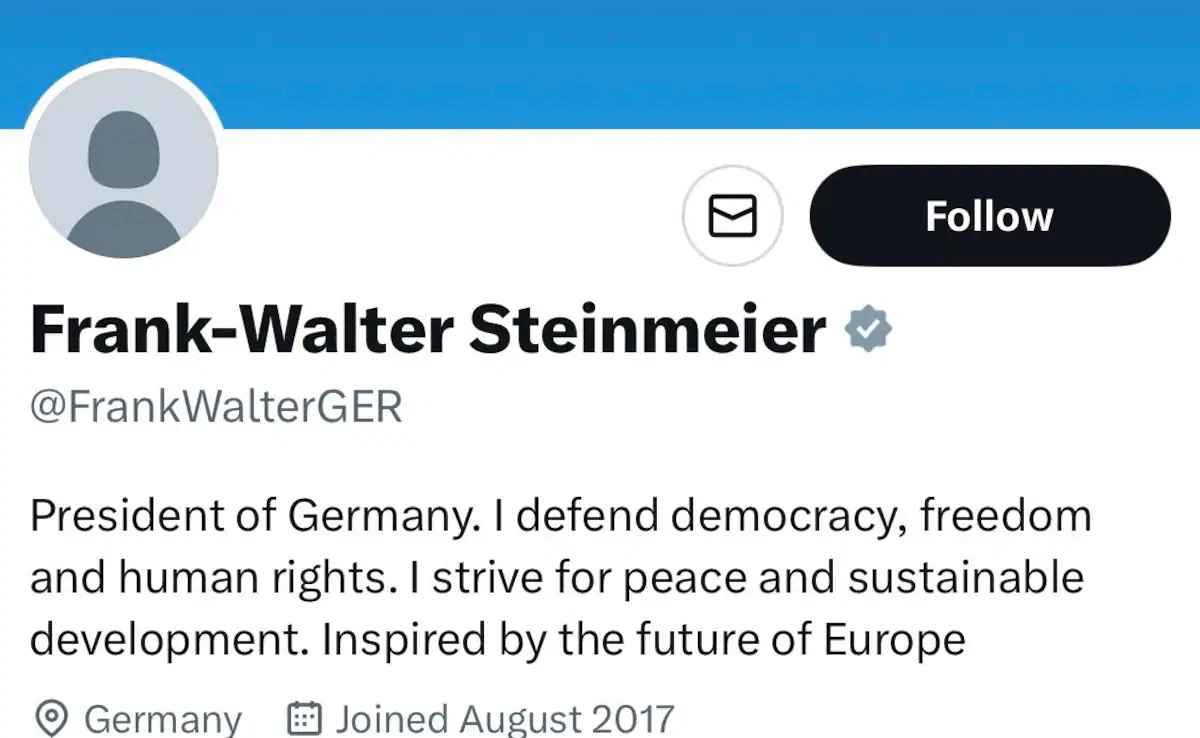 नई दिल्ली: जर्मन राष्ट्रपति फ्रैंक-वाल्टर स्टाइनमायर का आधिकारिक X (पूर्व में ट्विटर) अकाउंट हैक होने की खबरें आई हैं. हैकर्स ने इसे बिहार सरकार के जल संसाधन विभाग के प्रोफाइल में बदल दिया है. हालांकि इस मामले पर जर्मन सरकार की तरफ से कोई आधिकारिक बयान नहीं आया है, लेकिन मीडिया रिपोर्ट्स के अनुसार इससे पहले हैकर्स ने इस अकाउंट को नाजी पार्टी के पूर्व नेता एडोल्फ हिटलर के सत्यापित पृष्ठ जैसा बना दिया था.